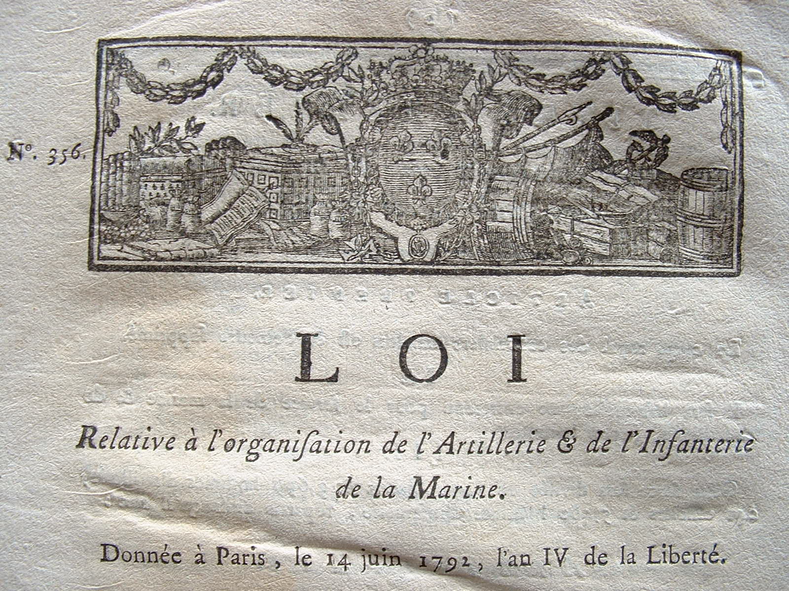 Décret «délibérant sur la proposition du roi, relative à l'organisation de l'artillerie et de l'infanterie de Marine». Le document définit, dans le détail, la composition des différents corps (cannoniers, grenadiers, état major, etc.), les salaires, les modes de recrutement et d'avancement dans l'artillerie et l'infanterie de Marine.