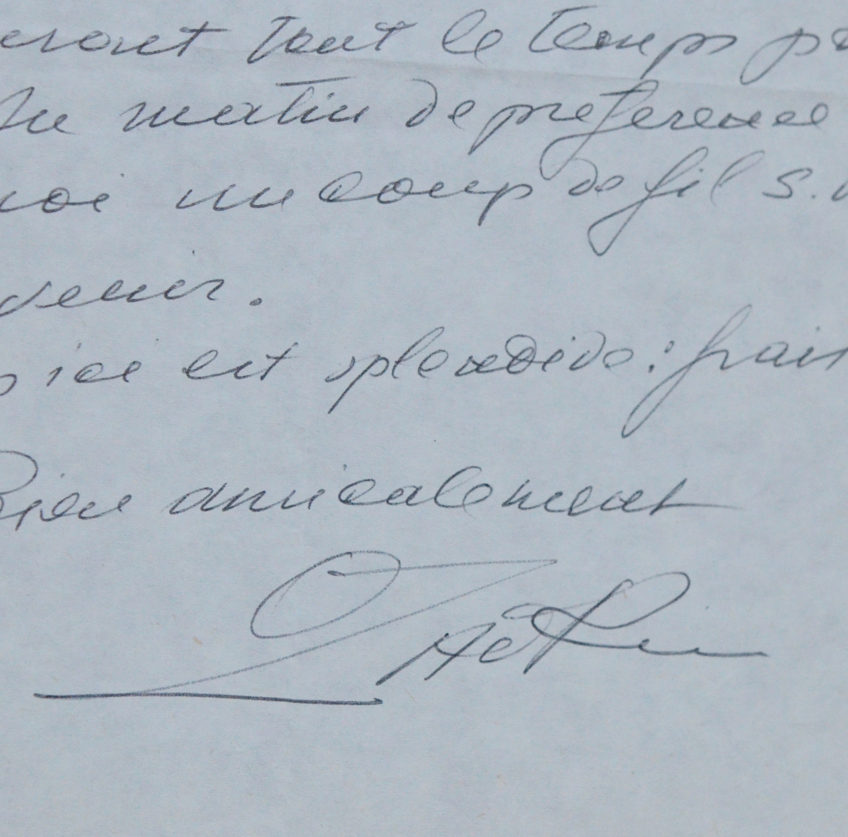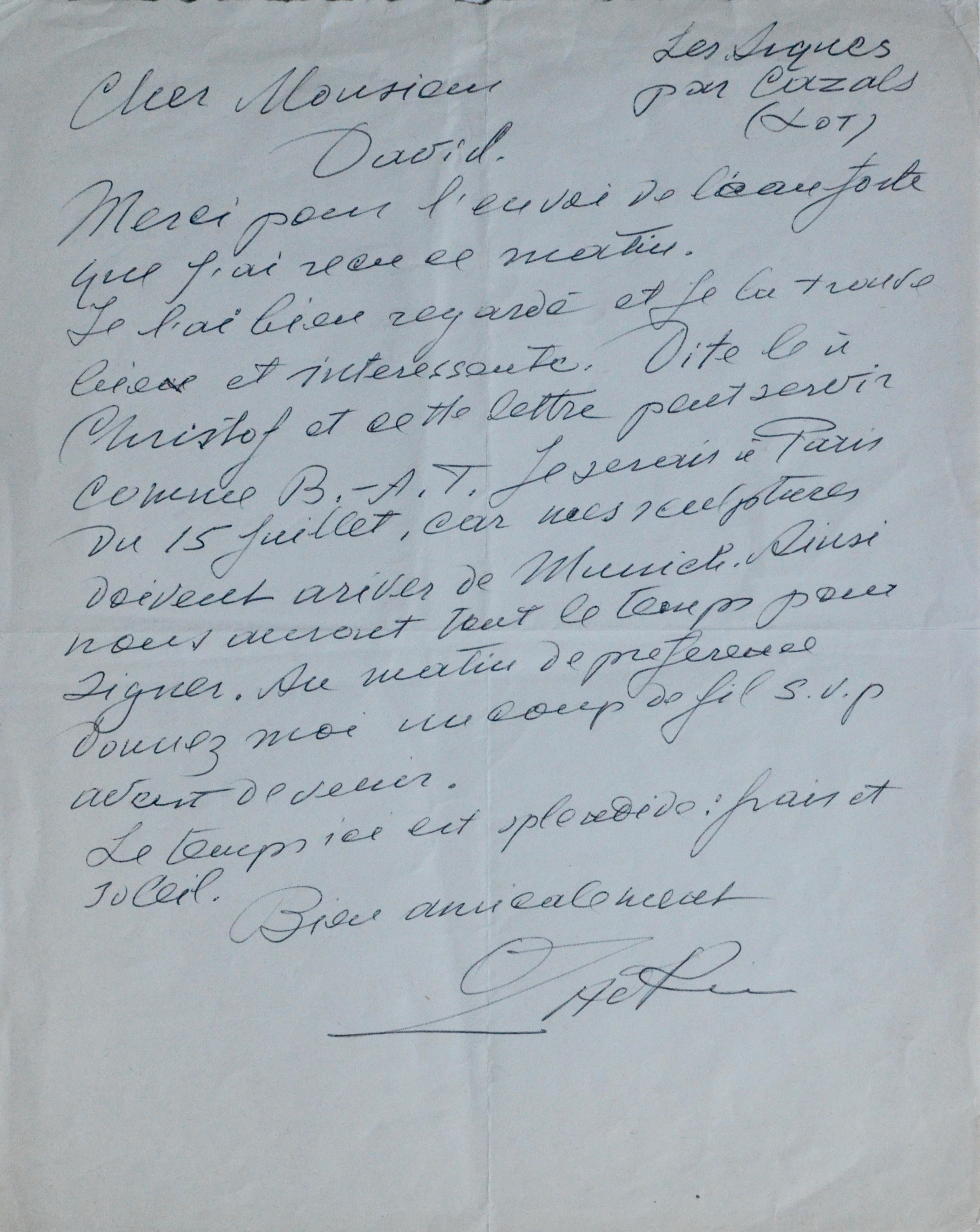 "Merci pour lenvoi de leau forte que jai reçue ce matin. Je lai bien regardée et je la trouve bien et intéressante. Dites-le à Christof et cette lettre peut servir comme B.A.T. Je serai à Paris le 15 juillet car mes sculptures doivent arriver de Munich. Ainsi nous aurons tout le temps pour signer. Au matin de préférence. Donnez-moi un coup de fil svp avant de venir. Le temps ici est splendide : frais et soleil".
