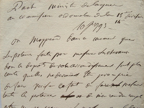 «On m'apprend, dans ce moment, que les potences faites pour mesurer les chevaux dans les dépôts de votre arrondissement sont plus courtes qu'elles ne devraient être ; je vous prie de faire vérifier ce fait, de faire mesurer toutes les potences et de m'en rendre compte afin que je prenne les mesures que le devoir de ma place m'oblige impérieusement de prendre».