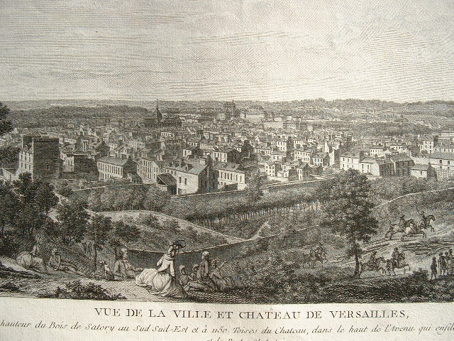 Très belle paire de vues animées de la ville de Versailles, gravées par François Denis Née (1732/1817), d'après les dessins de Louis Nicolas de Lespinasse (1734/1808). "Vue de la ville et du château de Versailles, prise au dessus de la butte de Picardie au bord du chemin de Saint-Cloud à l'est et à la distance de 1200 toises du château" et "vue de la ville et château de Versailles, prise de la hauteur du bois de Satory au sud sud-est et à 1150 toises du château, dans le haut de l'avenu [sic] qui enfile la tête du canal et la porte St Antoine".