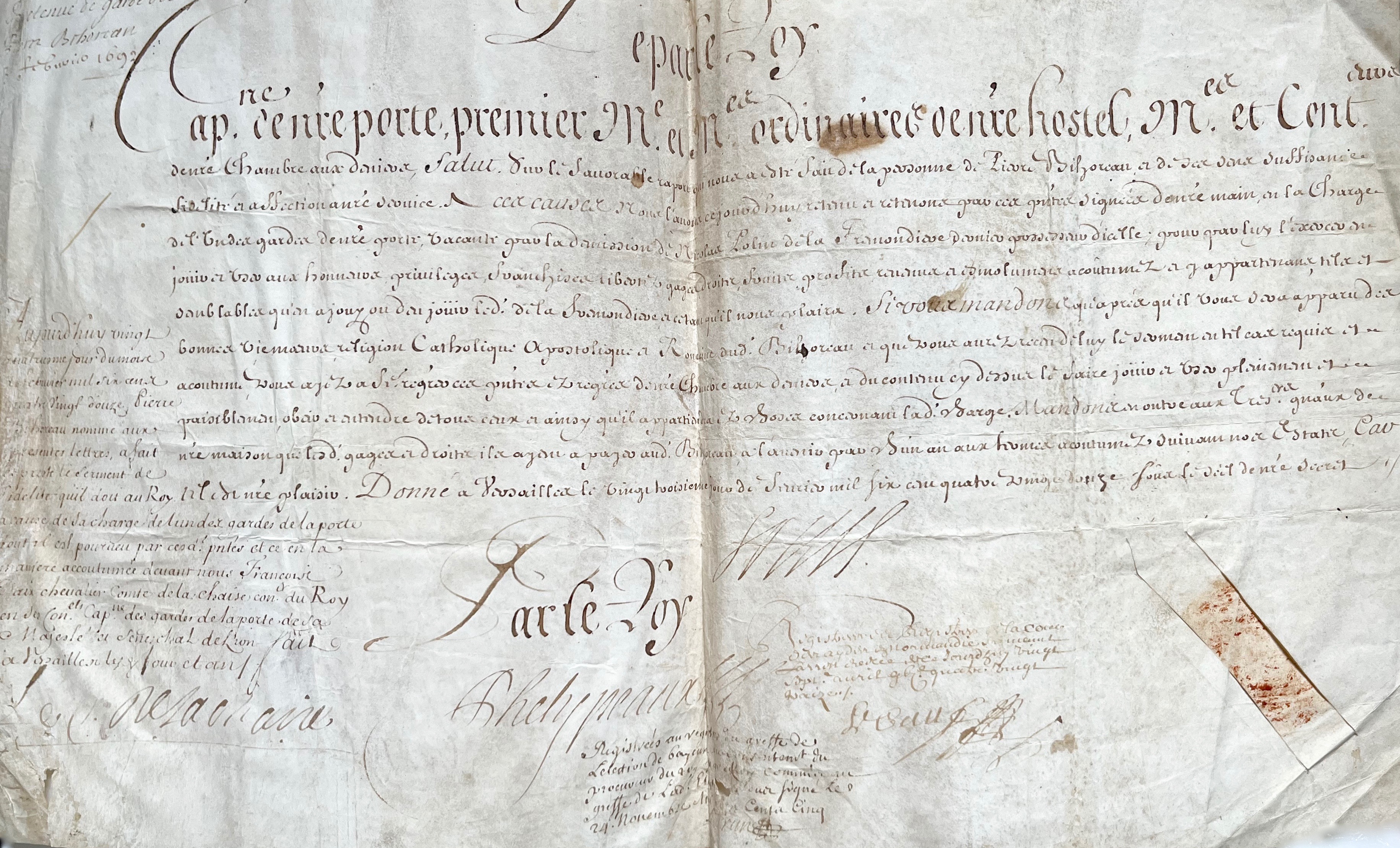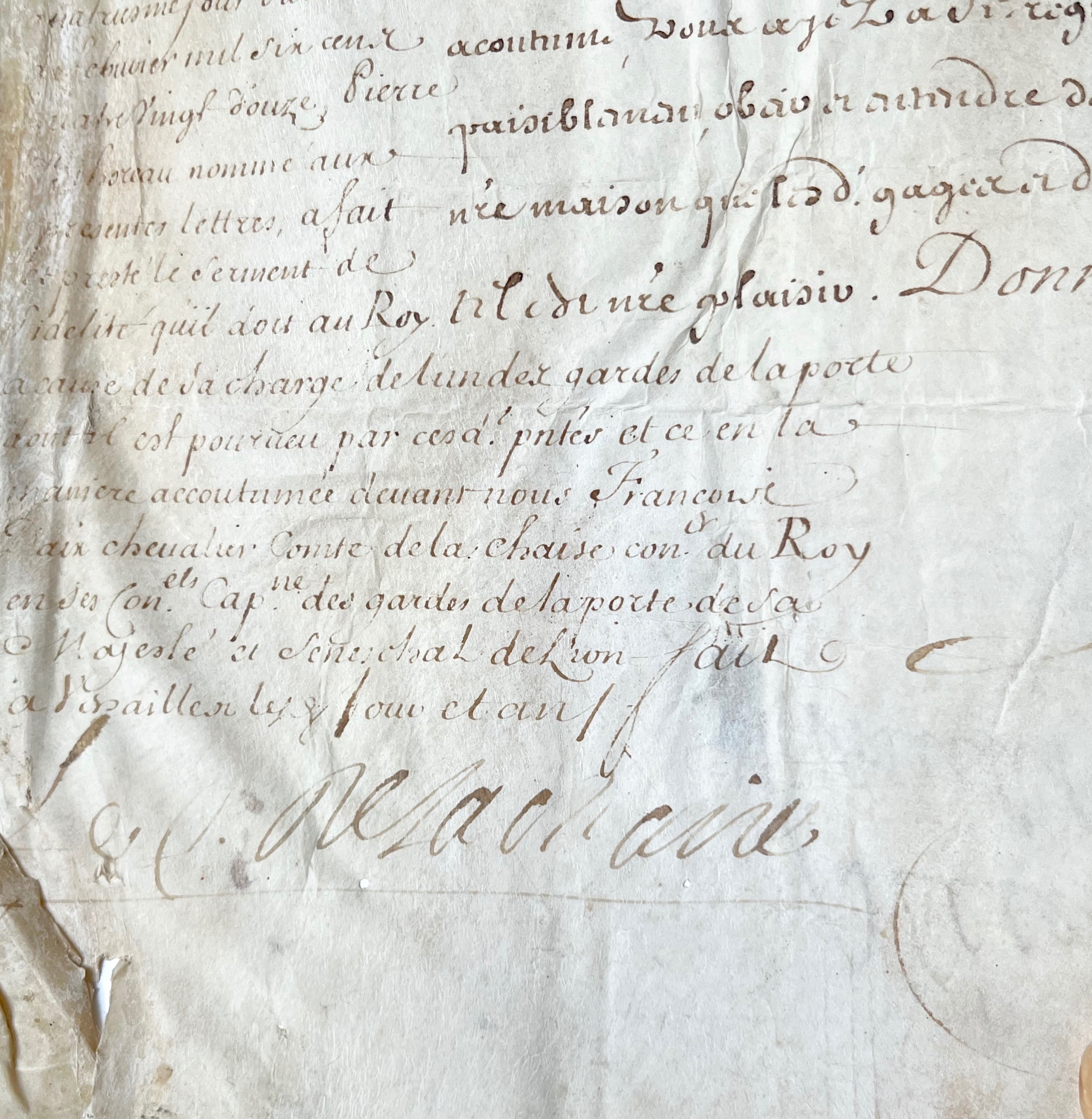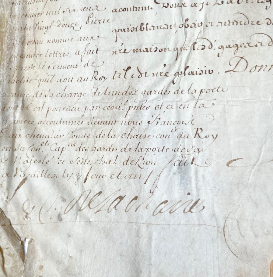 En marge mention manuscrite de prestation de serment, signée François d'Aix comte de La Chaise, (mort en 1697), capitaine des gardes de la Porte du Roi, sénéchal de Lyon, et neveu du Père Lachaise. Pierre Bihoreau "a fait et presté le serment de fidélité qu'il doit au Roy à cause de sa charge de l'un des gardes de la porte dont il est pourveu  par lesdites présentes et ce en la manière accoutumée devant nous François Daix chevalier compte de la Chaise conseiller du Roy en ses Conseils capitaine des gardes de la Porte de Sa Majesté et sénéchal de Lyon".