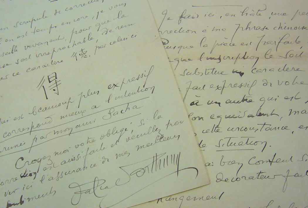 Pascal Forthuny (Paris, 1872/1962)L'étrange personnage que fut Pascal Forthuny avait obtenu son diplôme de chinois à l'Ecole des langues orientales, en 1915. Dans ces deux lettres, il conseille Sacha Guitry sur l'écriture d'idéogrammes chinois sur un panneau destiné à l'une de ses pièces. "Je fais ici, en hâte, une petite correction à ma phrase chinoise. Puisque la pièce est parfaite, il faut que l'inscription le soit et je substitue un caractère tout à fait expressif de votre pensée à un autre qui est, certes son équivalent, mais qui dans cette circonstance, est moins de situation. Je serais bien content si votre maître décorateur fait le changement. Je suis votre fidèle ami et je pense aux moyens de vous aider, vous et votre père, dans votre grande peine [...]". La seconde lettre est destinée au décorateur chargé de réaliser le panneau. "Parmi les caractères à inscrire sur le panneau chinois, figure celui-ci [idéogramme], dans la phrase [idéogrammes]. J'ai un scrupule de correction et s'il en est encore temps, je vous conseille vivement, pour que la phrase soit irréprochable, de remplacer ce caractère [idéogramme] par celui ci [idéogramme] qui est beaucoup plus expressif et correspond mieux à l'intention exprimée par monsieur Sacha".