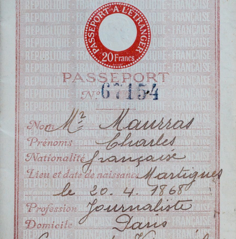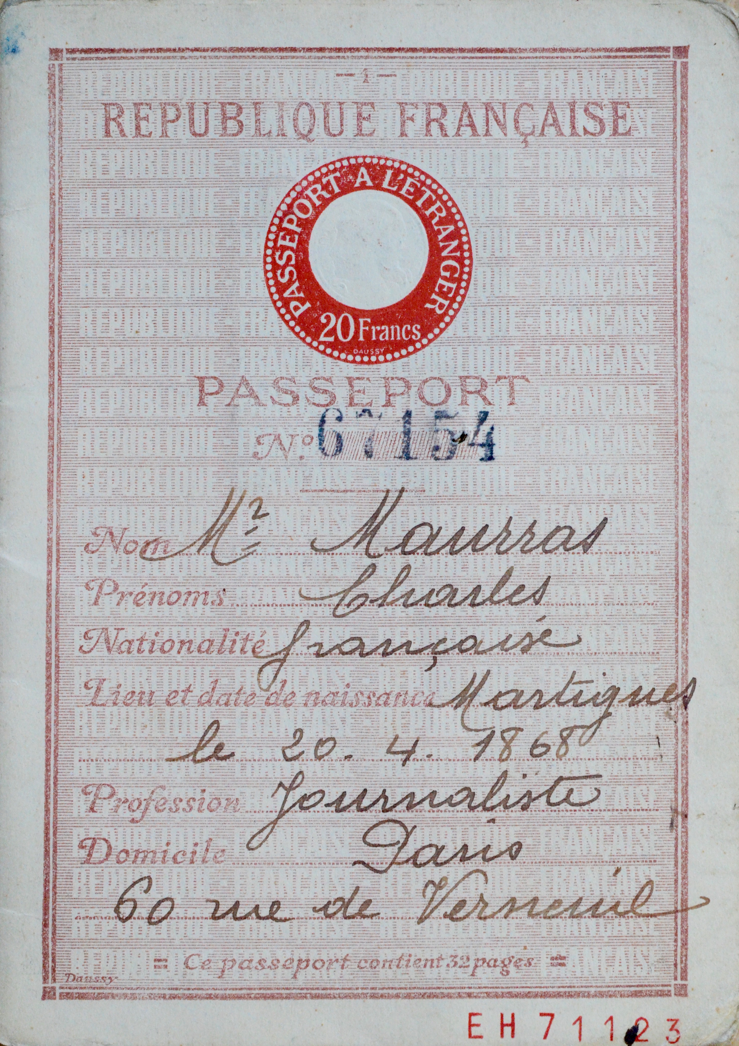 Passeport N° 67154, présentant l'état civil de Charles Maurras, né à Martigues le 20 avril 1868, domicilié au 60 rue de Verneuil à Paris, journaliste de profession. Son signalement stipule : taille 1,66 mètre, cheveux et yeux gris, front haut, nez moyen, bouche moyenne, barbe grise etc.