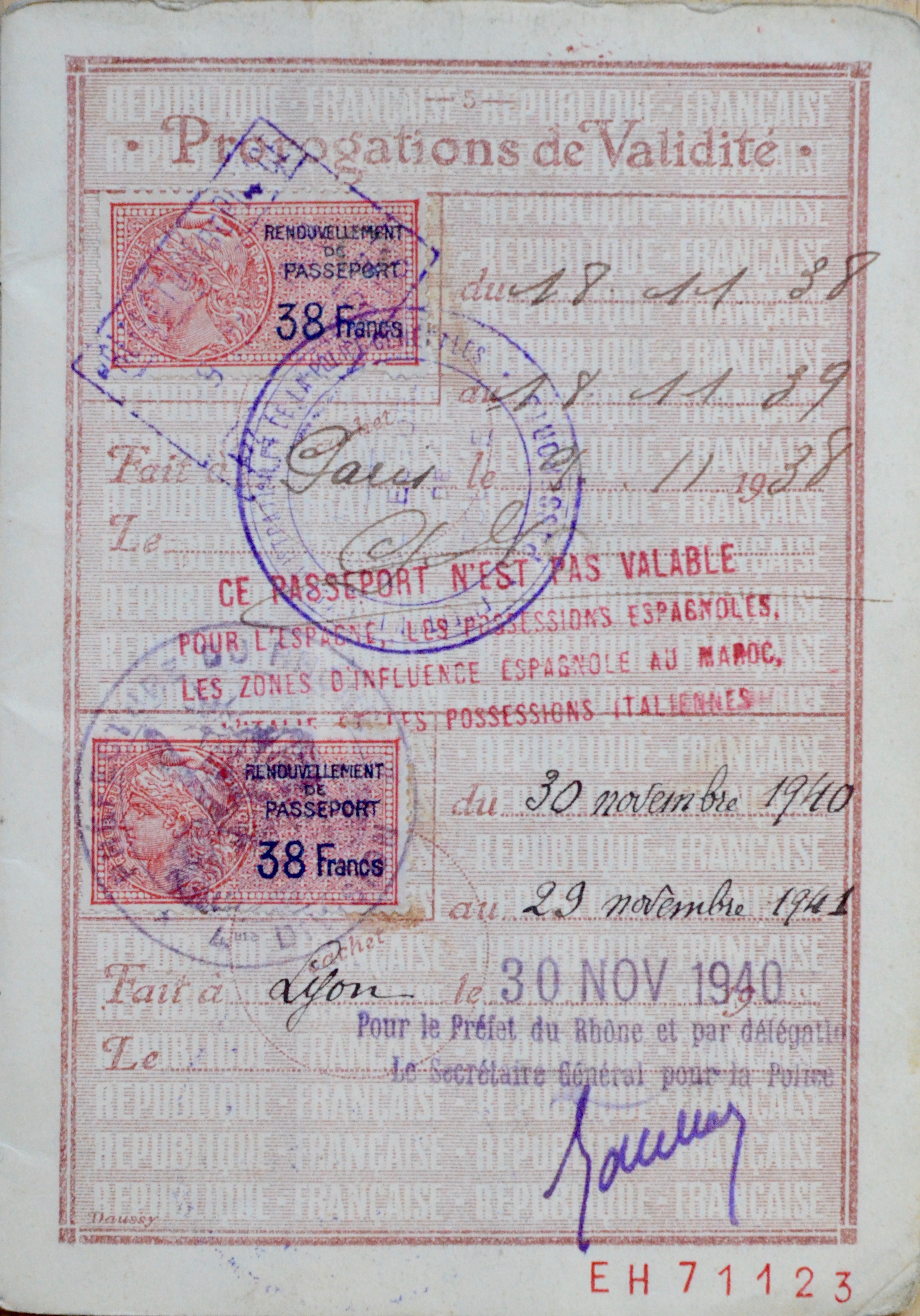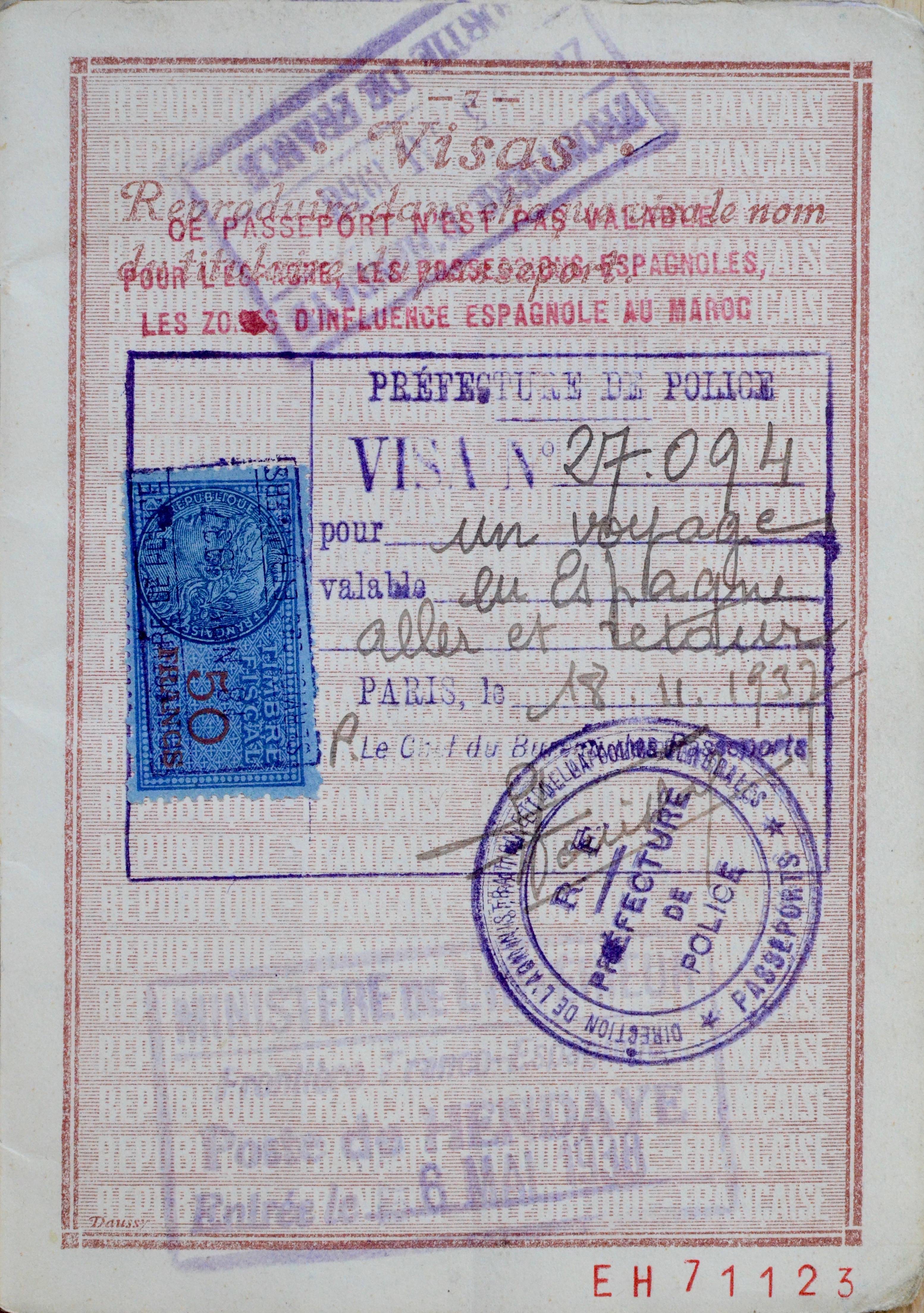 On compte plusieurs visas, vers l'Espagne : novembre 1937 ; mai 1938 et vers la Suisse : mars 1939 ; janvier, novembre et décembre 1940 ; mars 1942 (3).