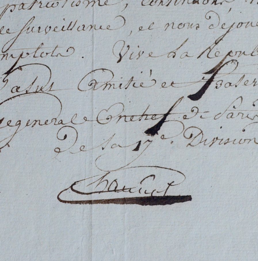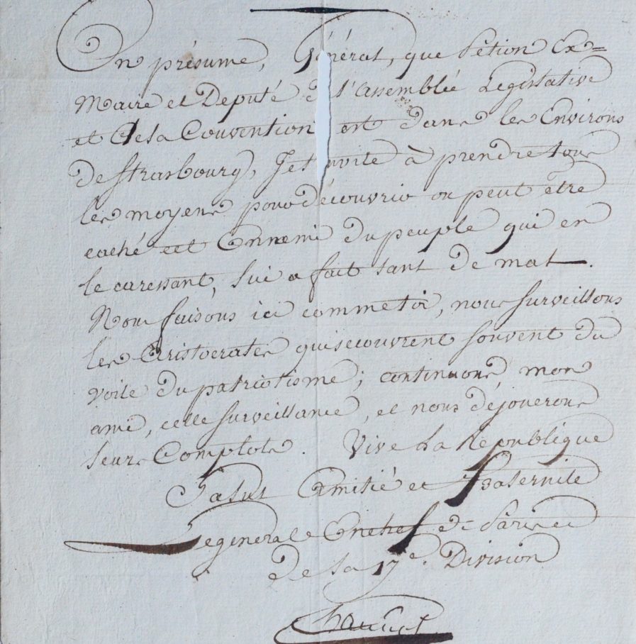 "On présume, Général, que Petion ex Maire et Député de l'Assemblée législative et de la Convention est dans les environs de Strasbourg, je t'invite à prendre tous les moyens pour découvrir ou peut être caché cet ennemi du peuple qui en le caressant, lui a fait tant de mal. Nous faisons ici comme toi, nous surveillons les Aristocrates qui se couvrent souvent du voile du patriotisme ; continuons, mon ami, cette surveillance, et nous déjouerons leurs complots. Vive la République. Salut Amitié et Fraternité [...]".