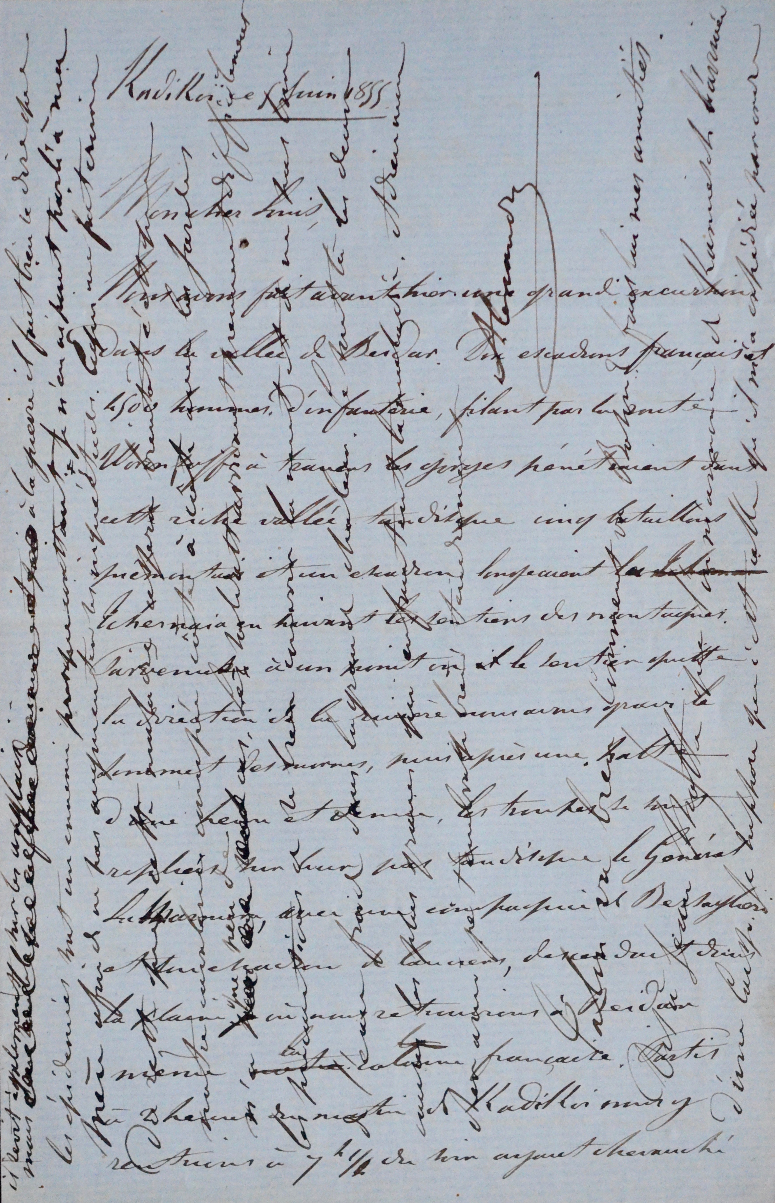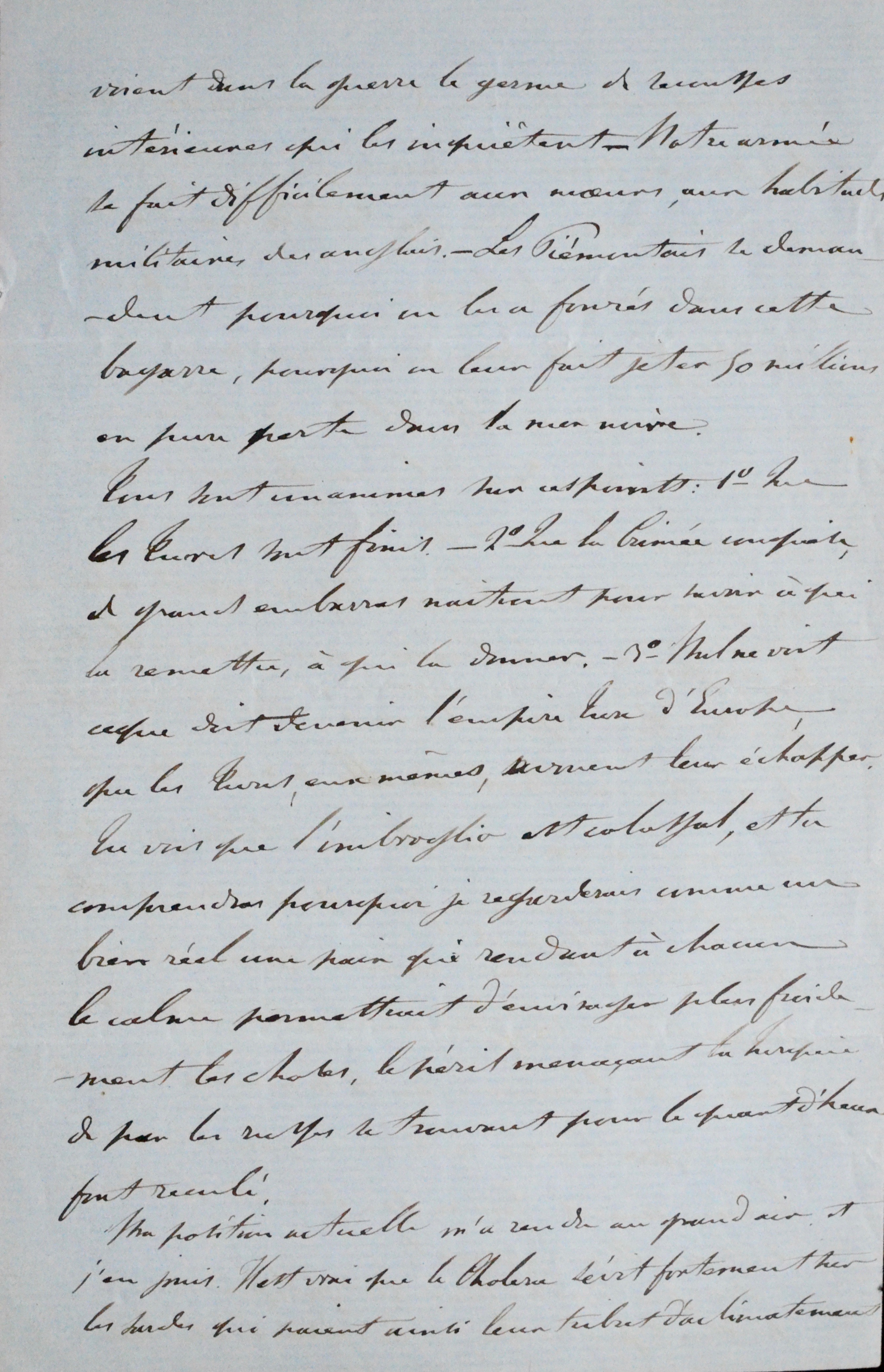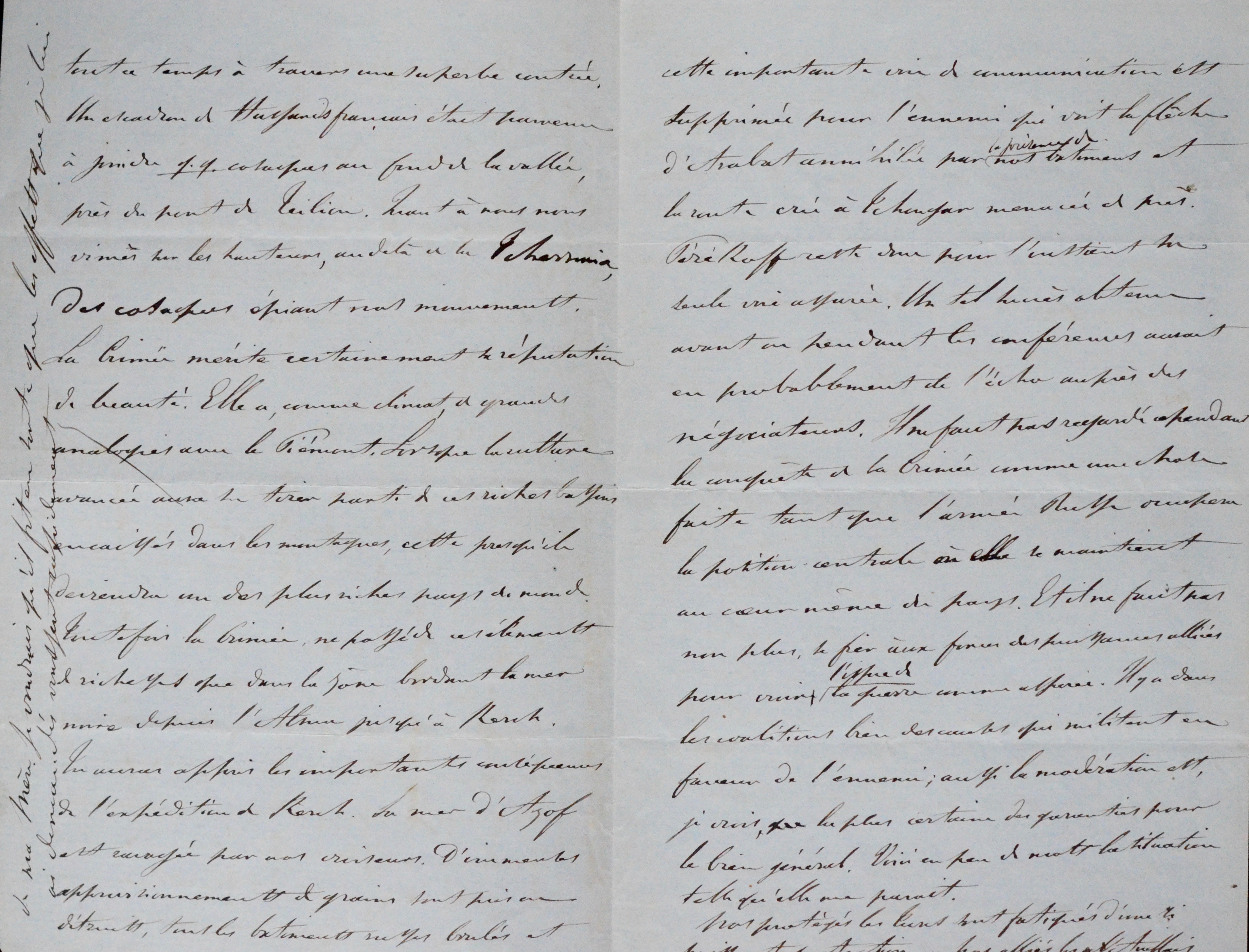 Il évoque les excursions des escadron français d'infanterie (4500 hommes), au bord de la rivière Tchernaïa, les superbes paysages "la Crimée mérite certainement sa réputation de beauté", compare le climat au Piémont, les cosaques qui "épient nos mouvements", l'expédition de Kertch, la mer d'Azov, l'armée russe, les positions menacées, les protégés turcs, les alliés anglais et l'incompatibilité des meurs et habitudes anglaises, "les Piémontais se demandent pourquoi on les a fourés dans cette bagarre, pourquoi on leur fait jeter 50 millions en pure perte dans la mer noire". L'officier énumère ensuite les avis unanimes des soldats sur la situation, évoque le choléra qui "sévit fortement", etc. "Tu auras appris les importantes conséquences de l'expédition de Kerch. La mer d'Azof est enrayée par nos croiseurs. D'immenses approvisionnements de grains sont pris ou détruits, tous les batiments russes brulés et cette importante voie de communication est supprimée pour l'ennemi qui voit le flèche d'Arabat annihilée par la présence de nos bâtiments [...]".