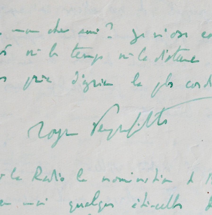 -le double d’une lettre Jean Vigneau à Étienne Gril, de la Société des gens de Lettres, 3 octobre 1942, le consultant sur la signature du contrat avec Peyrefitte, « écrivain de grand talent et de grand avenir »…