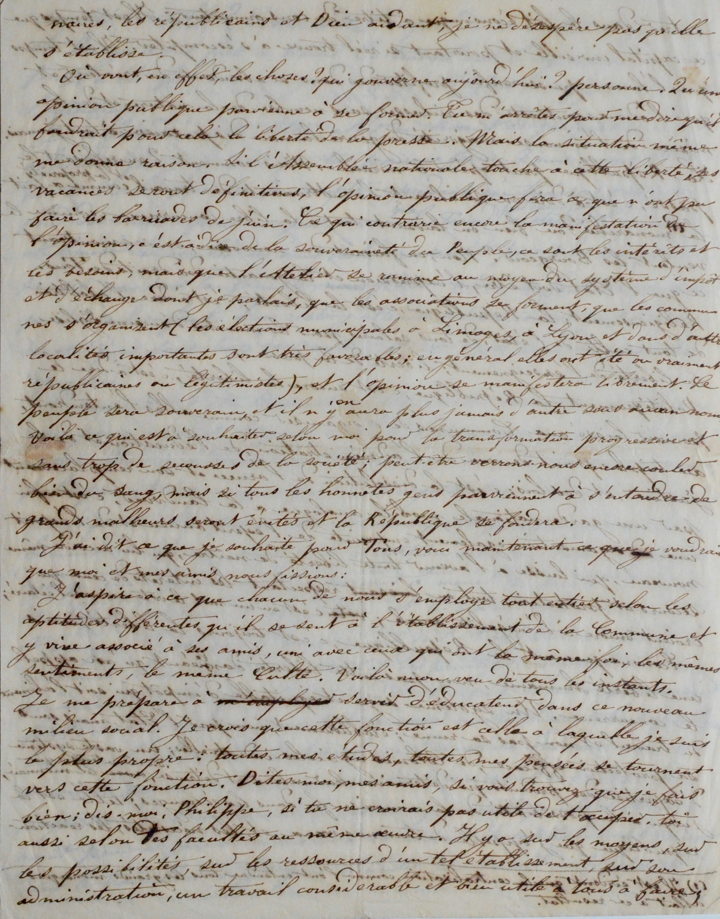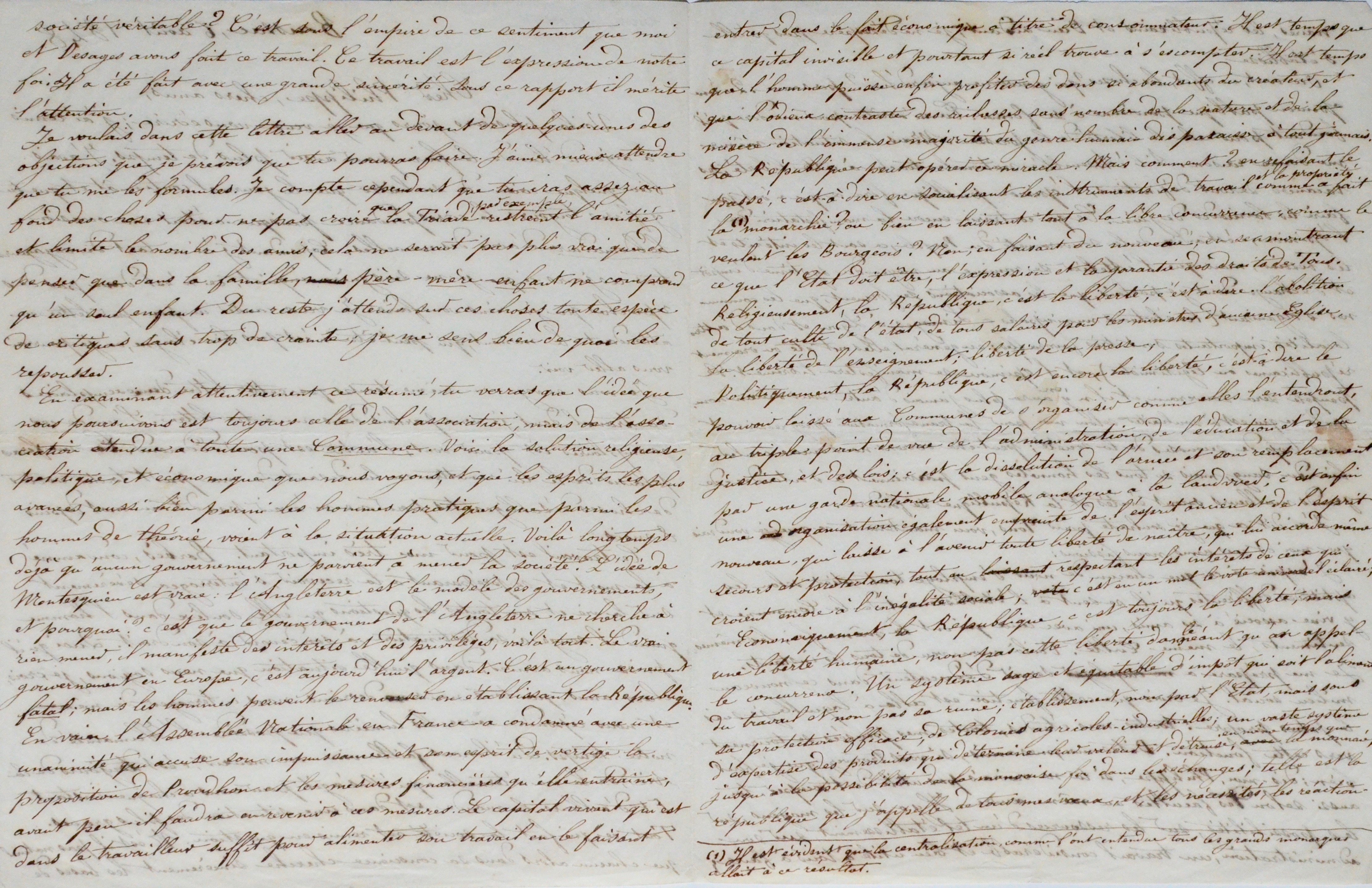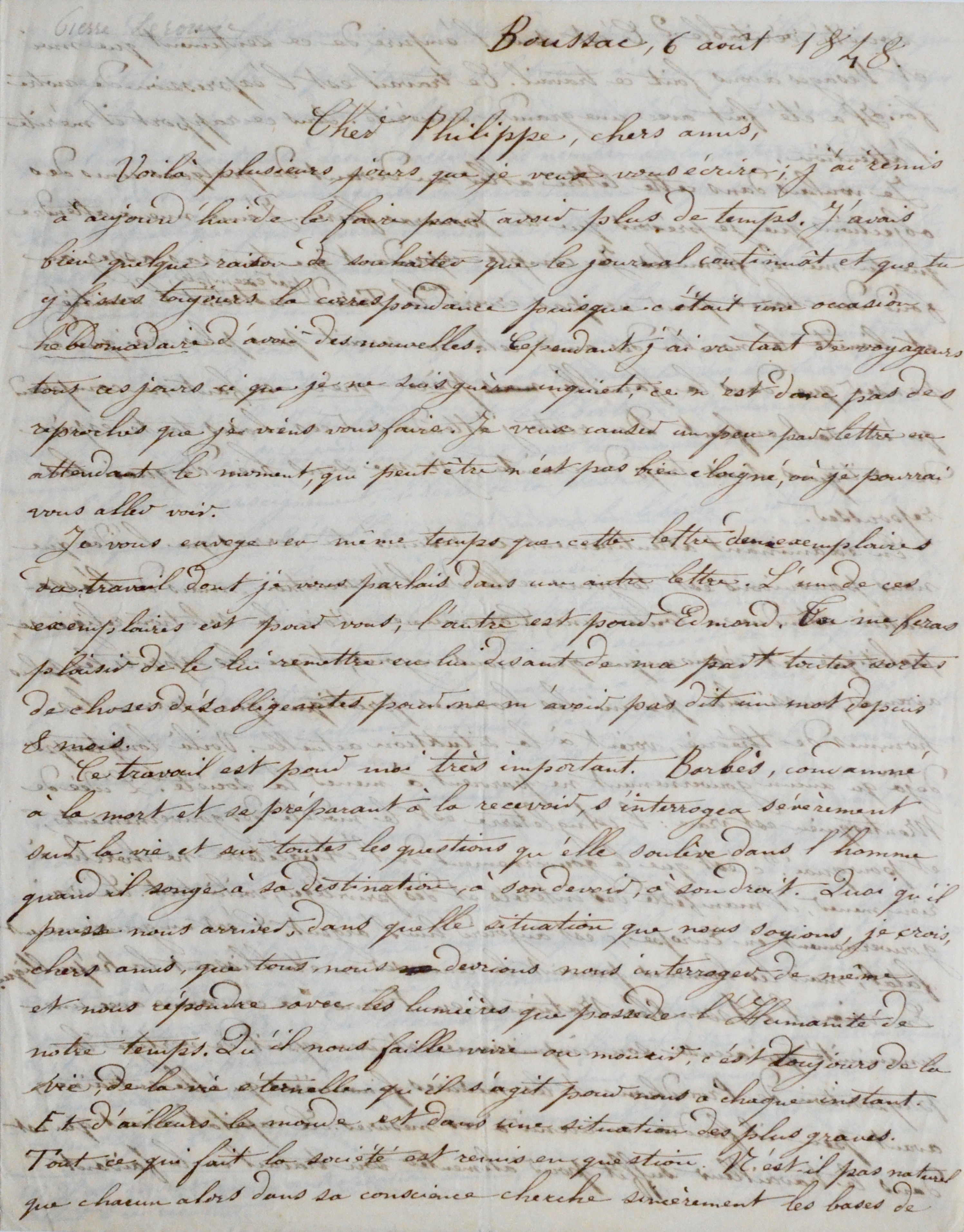 Pierre Leroux (Paris, 1797/1871)Belle et importante lettre de Pierre Leroux (probablement incomplète de la fin) consacrée à ses théories politiques et sociétales et leur application à Boussac dans la Creuse. « En examinant attentivement ce résumé, tu verras que l’idée que nous poursuivons est toujours celle de l’association ; mais de l’association étendue à toute une Commune. Voici la solution religieuse, politique et économique que nous voyons, et que les esprits les plus avancés, aussi bien parmi les hommes pratiques que parmi les hommes de théorie, voient à la actuelle. Voilà longtemps déjà qu’aucun gouvernement ne parvient à mener la société. L’idée de Montesquieu est vraie : l’Angleterre est le modèle des gouvernements, et pourquoi ? C’est que le gouvernement de l’Angleterre ne cherche à rien mener, il manifeste des intérêts et des privilèges, voilà tout. C’est un gouvernement fatal, mais les hommes peuvent le renverser en établissant la République […]. Il est temps que l’homme puisse enfin profiter des dons si abondants du créateur, et que l’odieux contraste des richesses sans nombre de la nature et de la misère de l’immense majorité du genre humain disparaisse à tout jamais ». Il développe longuement ses vues de la République idéale et invite ses amis à le rejoindre. « J’ai dit ce que je souhaite pour tous, voici maintenant ce que je voudrais que moi et mes amis fissions : j’aspire à ce que chacun de nous s’emploie tout entier selon les aptitudes différentes qu’il se sent à l’établissement de la commune et visse, associé à ses amis, uni avec ceux qui ont la même foi, les mêmes sentiments, le même culte. Voilà mon vœu de tous les instants. Je me prépare à servir d’éducateur dans ce nouveau milieu social. Je crois que cette fonction est celle à laquelle je suis le plus propre : toutes mes études, toutes mes pensées se tournent –vers cette fonction. Dites-moi, mes amis, si vous trouvez que je fais bien ; dis-moi, Philippe, si tu ne croirais pas utile de t’occuper toi aussi, selon tes facultés, au même œuvre […] ».