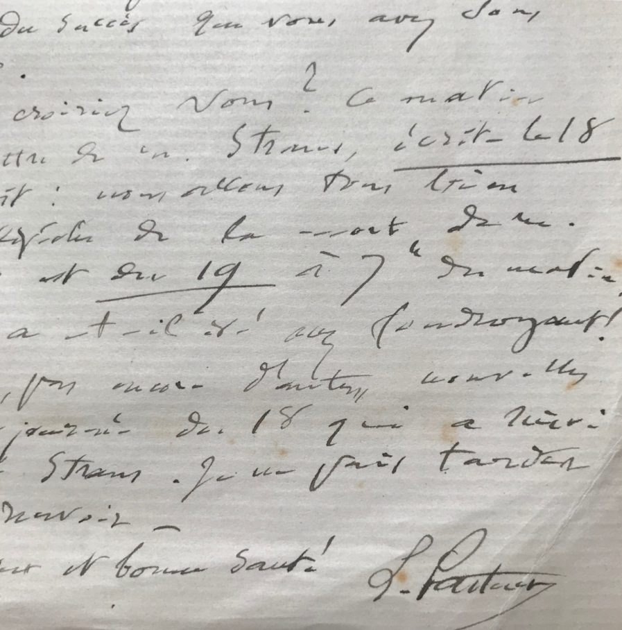 « [...] Cet entrefilet du journal que vous m'envoyez, relatif à un homme mis en danger par une coupure infectée de rouget correspond-il donc à une réalité ? Informez-vous. Ce serait fort curieux si cela était vrai. Il serait bon de faire une enquête à ce sujet. Je serais heureux de recevoir l'adresse que vous m'annoncez. Hélas ! Pourquoi ce cher et vaillant Thuillier ne peut-il s'associer à la joie du succès que vous avez sous les yeux. Le croiriez vous ? Ce matin une lettre de M. Straus, écrite le 18 me dit : nous allons tous bien et la dépêche de la mort de M. Roux est du 19 à 7h du matin. Le cas a-t-il été assez foudroyant ! Du reste, pas encore d'autres nouvelles pour la journée du 18 qui a suivi la lettre Straus. Je ne puis tarder de les recevoir. Bonjour et Bonne santé ! L. Pasteur.»