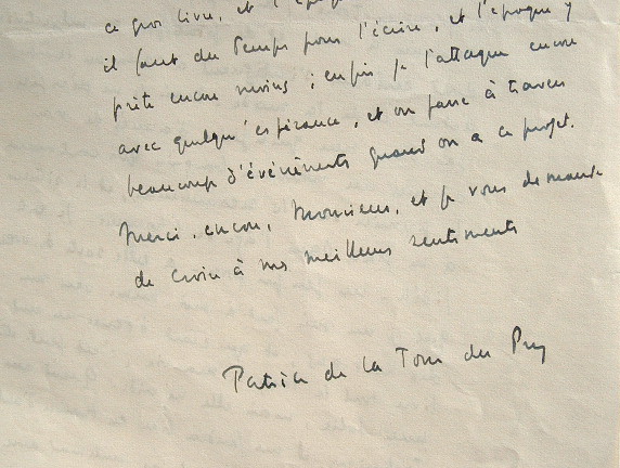 Patrice La Tour du Pin (de) (Paris, 1911/1975)Très belle lettre de Patrice de La Tour du Pin, écrite lors de la publication du premier tome de la Somme de Poésie. «Je vous avouerai qu'on a un peu de scrupule à envoyer un tel bottin à des critiques ! Et j'ai la prétention de le regarder comme un premier Tome ! La "vie privée" que j'ai voulu traiter devrait être suivie d'une "vie publique", ce qui me semble assez normal, mais le pas que j'ai à franchir en ce moment est bien mal aisé". Il éprouve, en effet, des difficultés à trouver de nouvelles voies. «Cela durera le temps qu'il faudra, et bien que certains thèmes semblent y conduirent directement dans ce premier Tome, j'ai trop pris l'habitude de ramener à moi et de pratiquer ce subjectivisme dont certains s'indignent à cause du temps actuel et de la mode». Il espère lui adresser la suite dans une quinzaine d'années, «qui continuera le premier sans le recommencer, et le situera à sa place dans l'âge de l'homme. Je reste fidèle - un peu par force - à cette sorte de voeu que je me suis fait à moi-même vers mes dix-huit ans, et qui était d'écrire un seul livre tout au long de ma vie ; c'est peut-être une folie, mais elle m'aide. Quant aux techniques, il faudra bien en trouver d'autres : je sais bien que ce n'est pas seulement avec des mots qu'on fait de la poésie, quoi qu'on prétende actuellement, et les successions d'images ne sont pas mon fort, ni surtout les débats esthétiques à propos de la poésie ; elle n'est toujours pour moi qu'un moyen, et je ne la déchargerai pas volontairement de toute musique ni de toute pensée, pour qu'elle soit plus précieuse. Alors, il faut que je cherche autre part [...]».