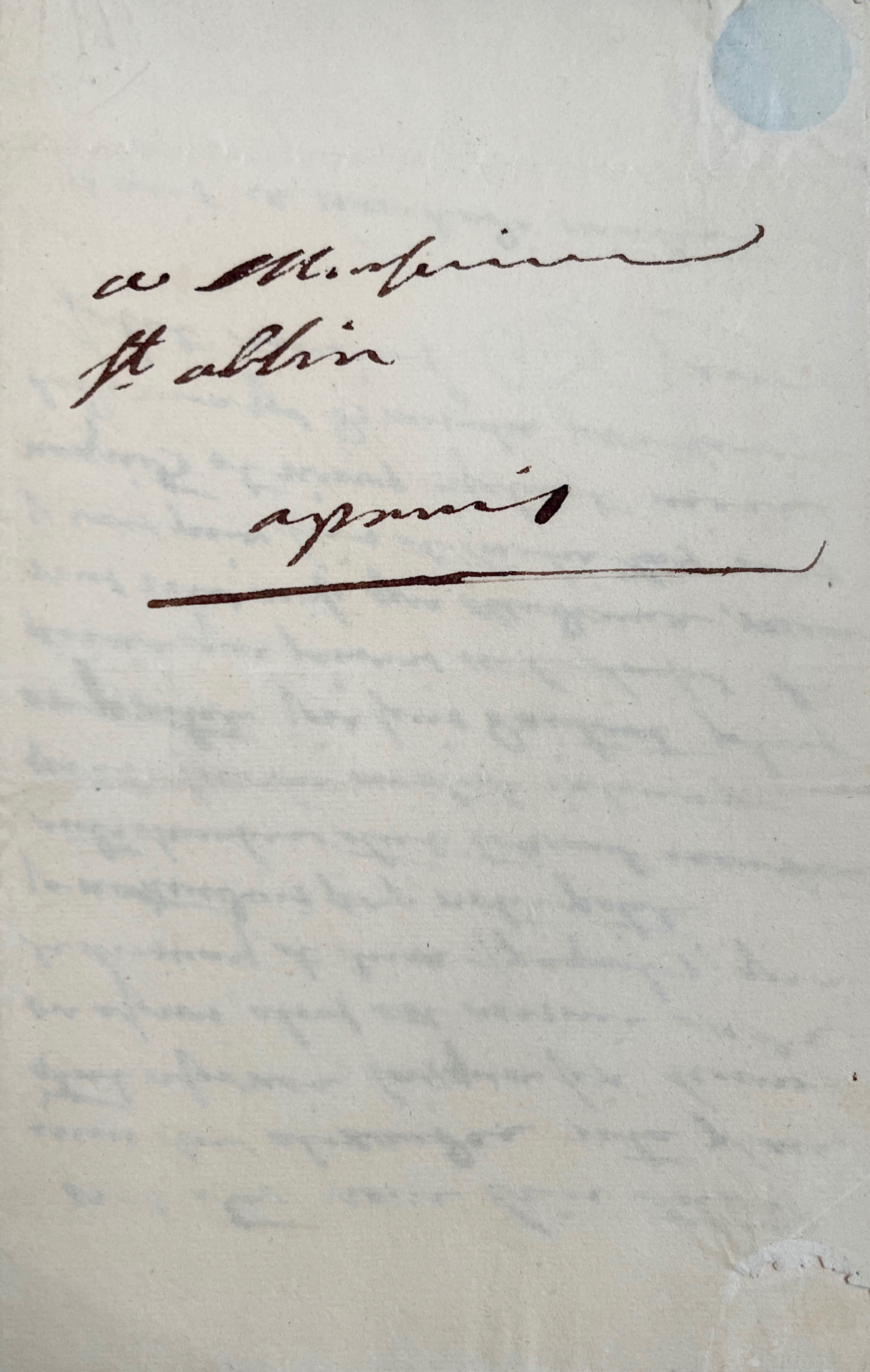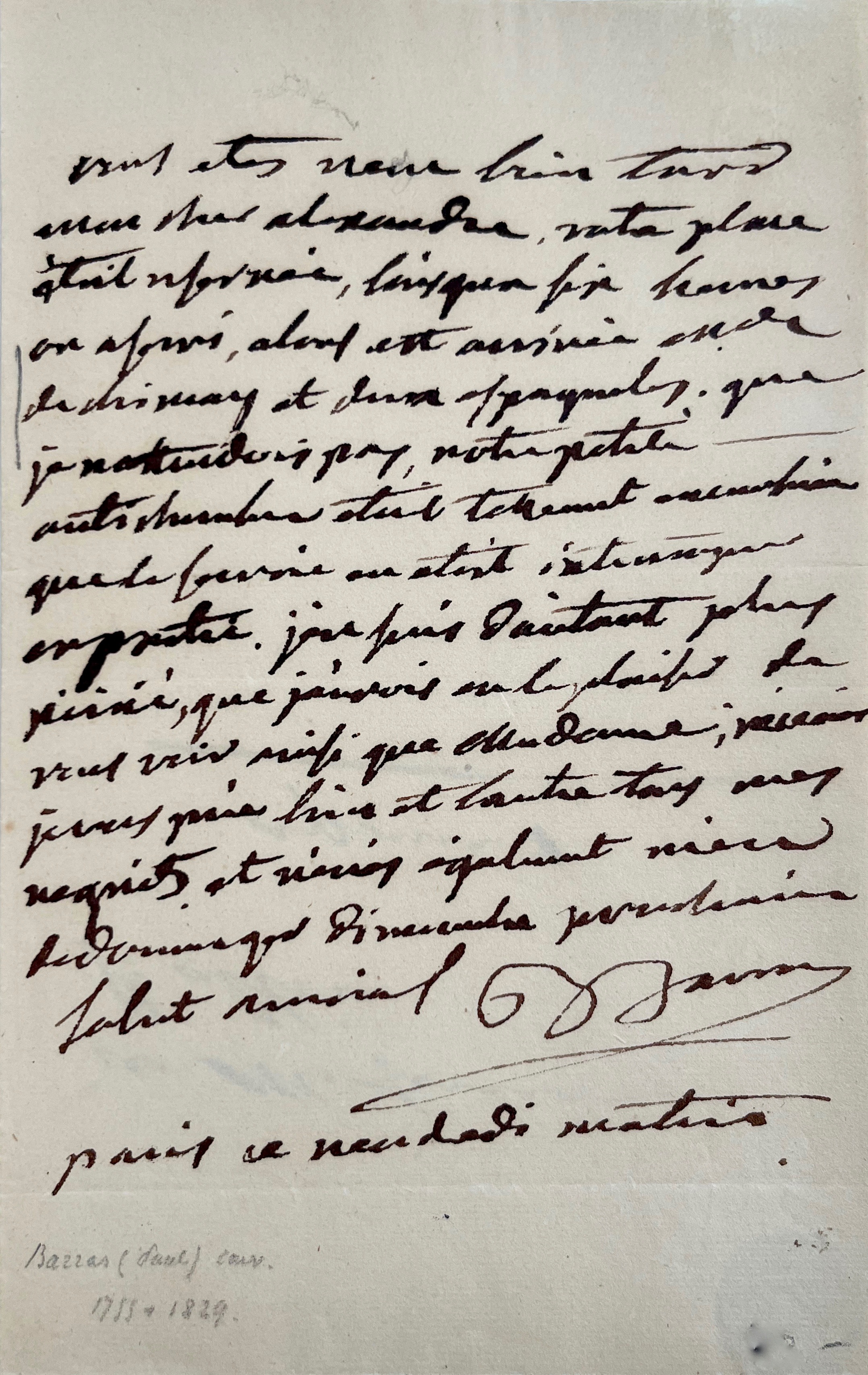 "Vous êtes venu bien tard mon cher Alexandre, votre place était réservée, jusqu'a six heures. On a servi, alors est arrivée Madame de Chimay et deux espagnoles que je n'attendais pas. Notre petite antichambre était tellement encombrée [...]". Barras est désolé d'avoir manqué son ami et son épouse et fixe un nouveau rendez-vous.