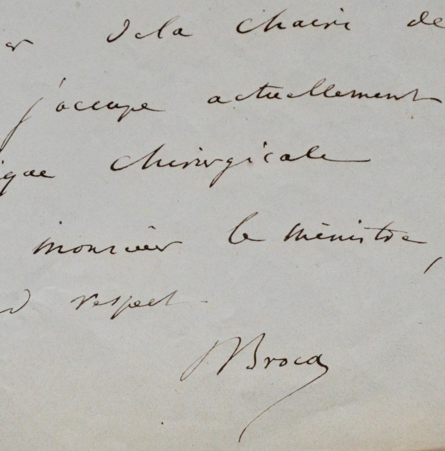 "Monsieur le professeur Denonvilliers ayant reprit son ancienne chaire, et laissé vacante une chaire de clinique chirurgicale, je viens vous prier de vouloir bien m'autoriser à passer de la chaire de pathologie externe que j'occupe actuellement à la chaire de clinique chirurgicale [...]".