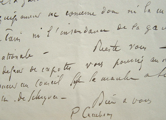 Lettre de Paul Cambon écrite durant le siège de Paris, alors qu'il est chef de cabinet de Jules Ferry, membre du gouvernement de la Défense nationale et fraîchement élu maire de Paris (16 novembre). Il envoie M. de Schryrer, «rédacteur de La Liberté et commandant d'une compagnie de volontaires armés mais non équipés. Cette compagnie, d'après ce qu'il me dit, n'est ni de la garde nationale sédentaire ni de la garde nationale de marche. Son équipement ne concerne donc ni la mairie de Paris ni l'intendance de la garde nationale. A défaut de capotes vous pourriez au moins donner un conseil sur la marche à tenir (...]».