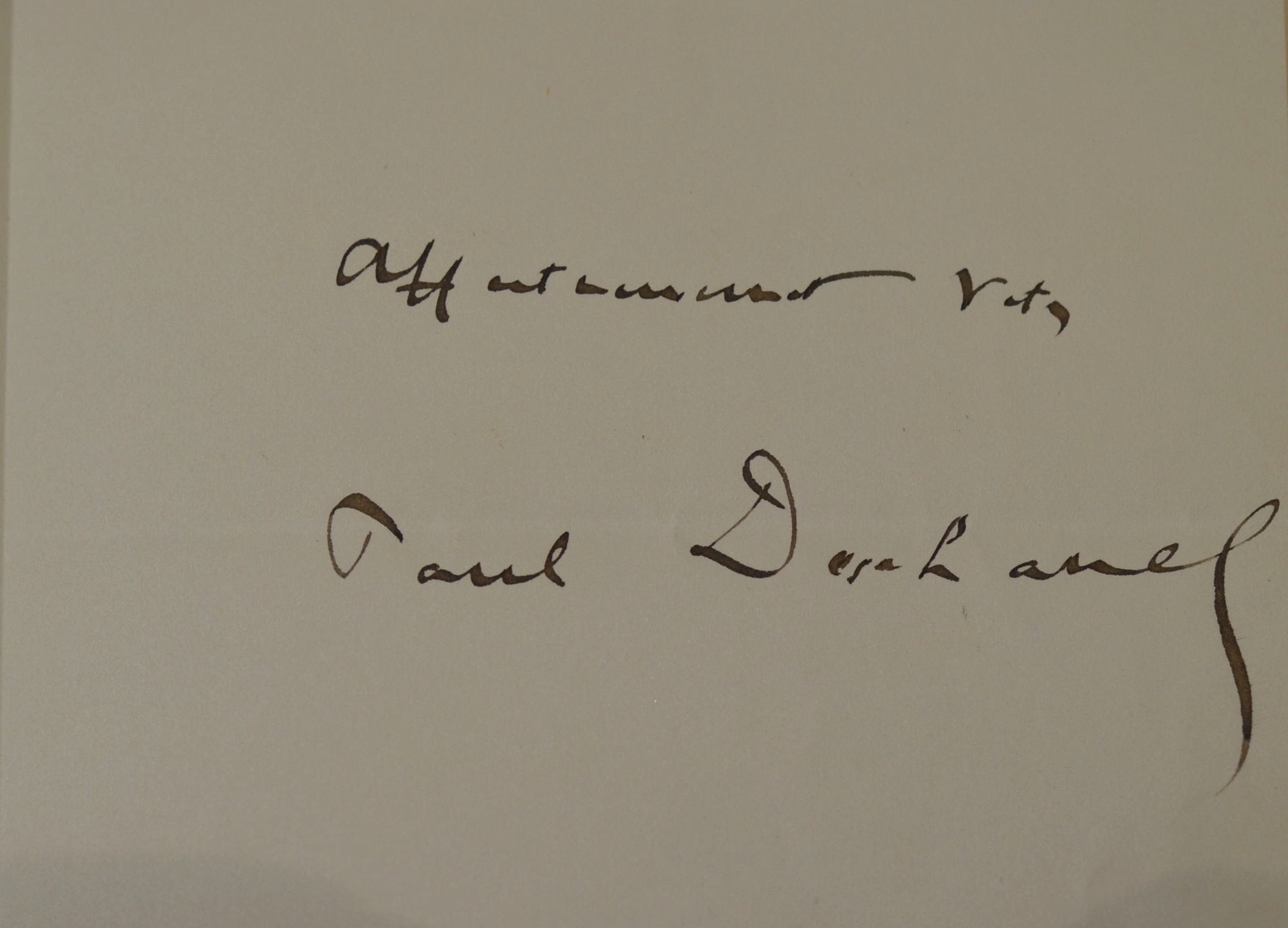 Paul Deschanel exprime son indignation à son ami député sortant du Cantal, battu aux dernières législatives. "Je suis révolté par ces élections du Cantal! Pourquoi ce revirement? Ah! que l'avenir est obscur!Je suis navré de ne plus vous voir avec nous. Mais vous prendrez votre revanche!"