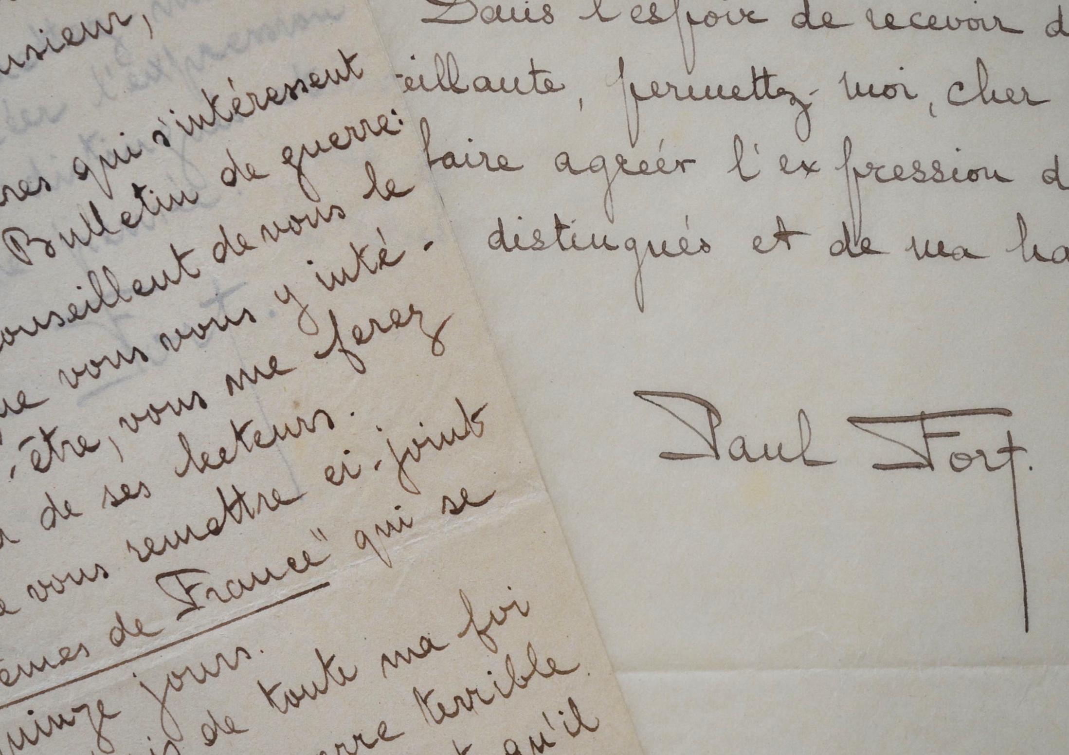 Dans ces deux émouvantes lettres, Paul Fort défend avec coeur le bulletin qu'il dirige, Poèmes de France : « Ils paraissent deux fois par mois ; ils ne dureront qu'un an et se composeront, l'ouvrage terminé, de vingt-quatre numéros. J'écris avec fièvre, j'écris de toute ma force des "chants vengeurs" sur cette guerre terrible et sublime, - hélas ! "vengeurs" autant qu'il est en mon pouvoir. C'est pour moi une nécessité morale : je suis Rémois, né juste en face de la cathédrale assassinée, ce qui me donne un peu grâce d'état pour fustiger l'Allemand ! » Il espère avoir accompli « son devoir de poète » et susciter des abonnements. [La cathédrale de Reims fut détruite à 85% par les bombardements allemands, en 1914].