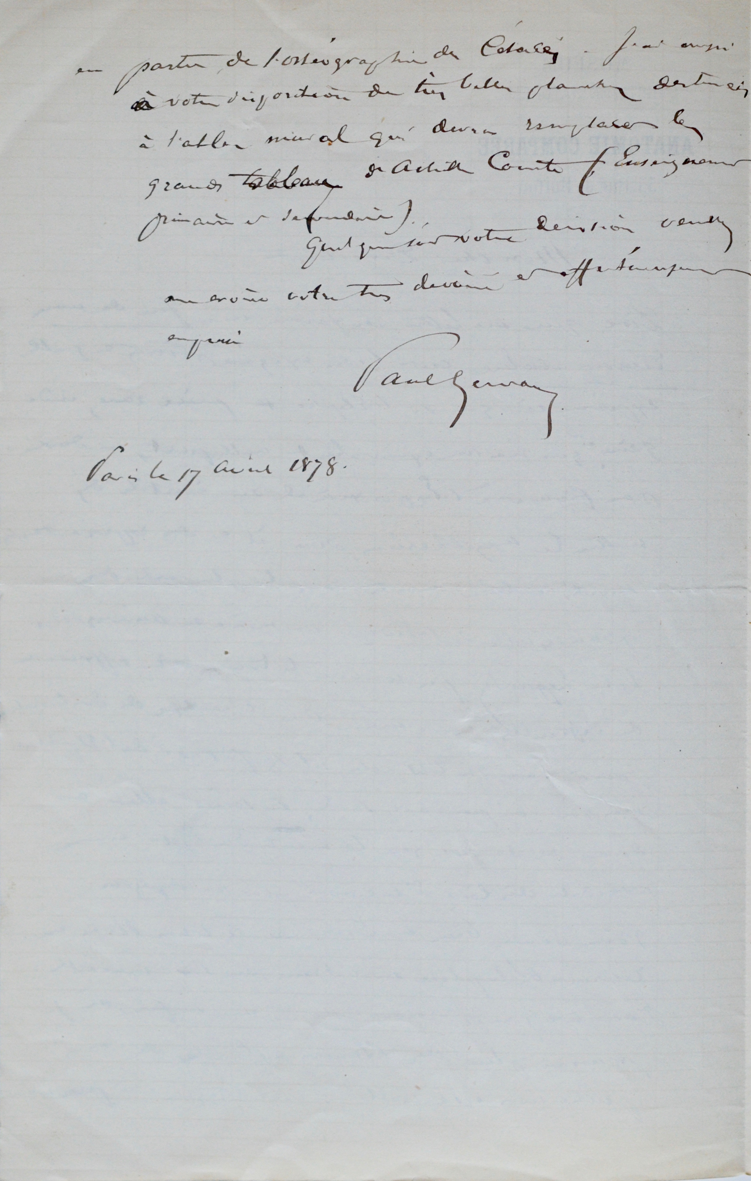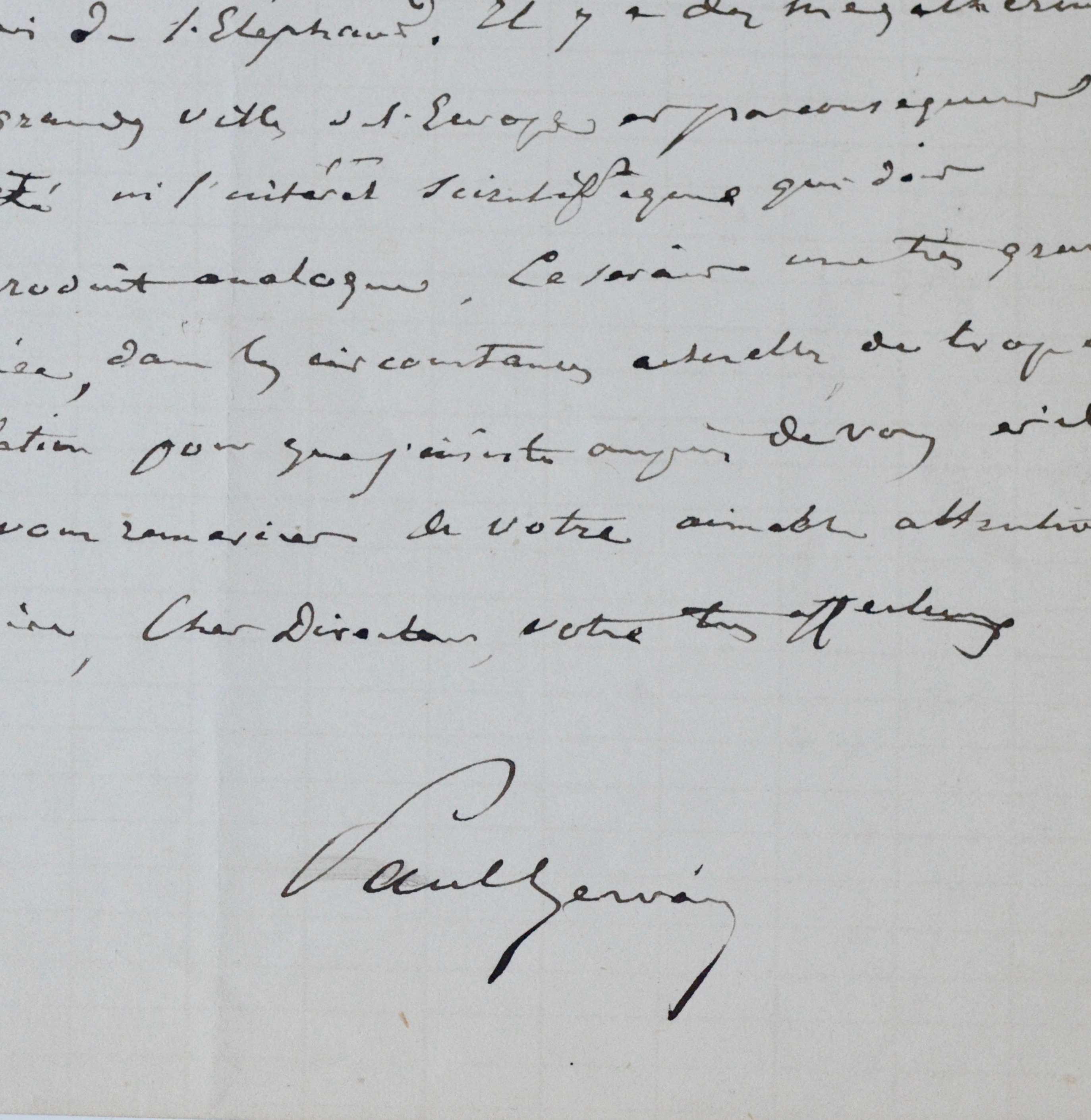 Paul Gervais était alors Directeur de la chaire d'Anatomie comparée du Muséum. Il pourrait s'adresser au Directeur général de l'établissement : Michel-Eugène Chevreul (1786-1889).