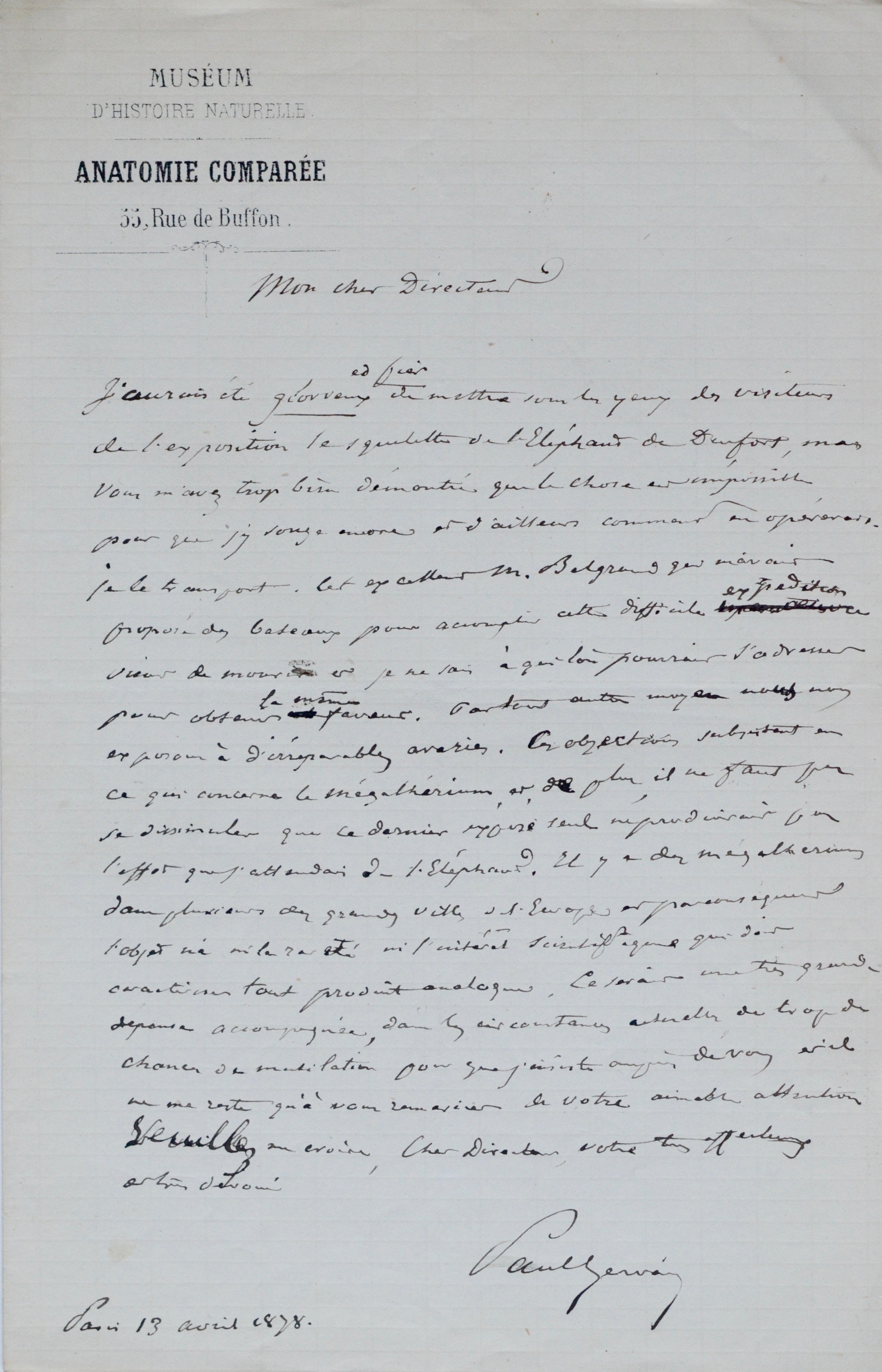 "[...] J'aurais été glorieux et fier de mettre sous les yeux des visiteurs de l'exposition le squelette de l'éléphant de Durfort, mais vous m'avez trop bien démontré que la chose est impossible pour que j'y songe encore et d'ailleurs comment en opèrerais-je le transport. Cet excellent M. Belgrand qui m'avait proposé des bateaux pour accomplir cette difficile expédition vient de mourir et je ne sais à qui l'on pourrait s'adresser pour obtenir la même faveur. Par tout autre moyen nous nous exposons à d'irréparables avaries. Ces objections subsistent en ce qui concerne le mégathérium, et, de plus, il ne faut pas se dissimuler que ce dernier exposé seul ne produirait pas l'effet que j'attendais de l'éléphant. Il y a des mégathériums dans plusieurs des grandes villes [...]". (13/04/1878).