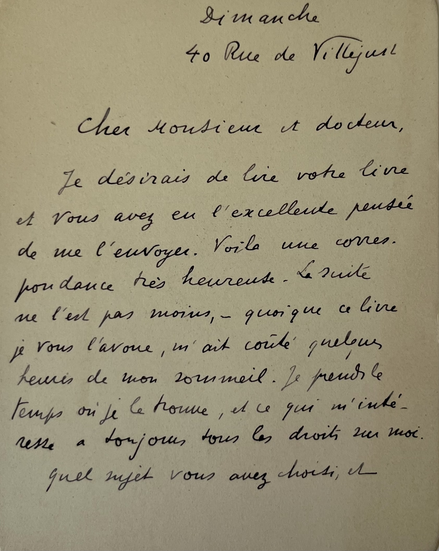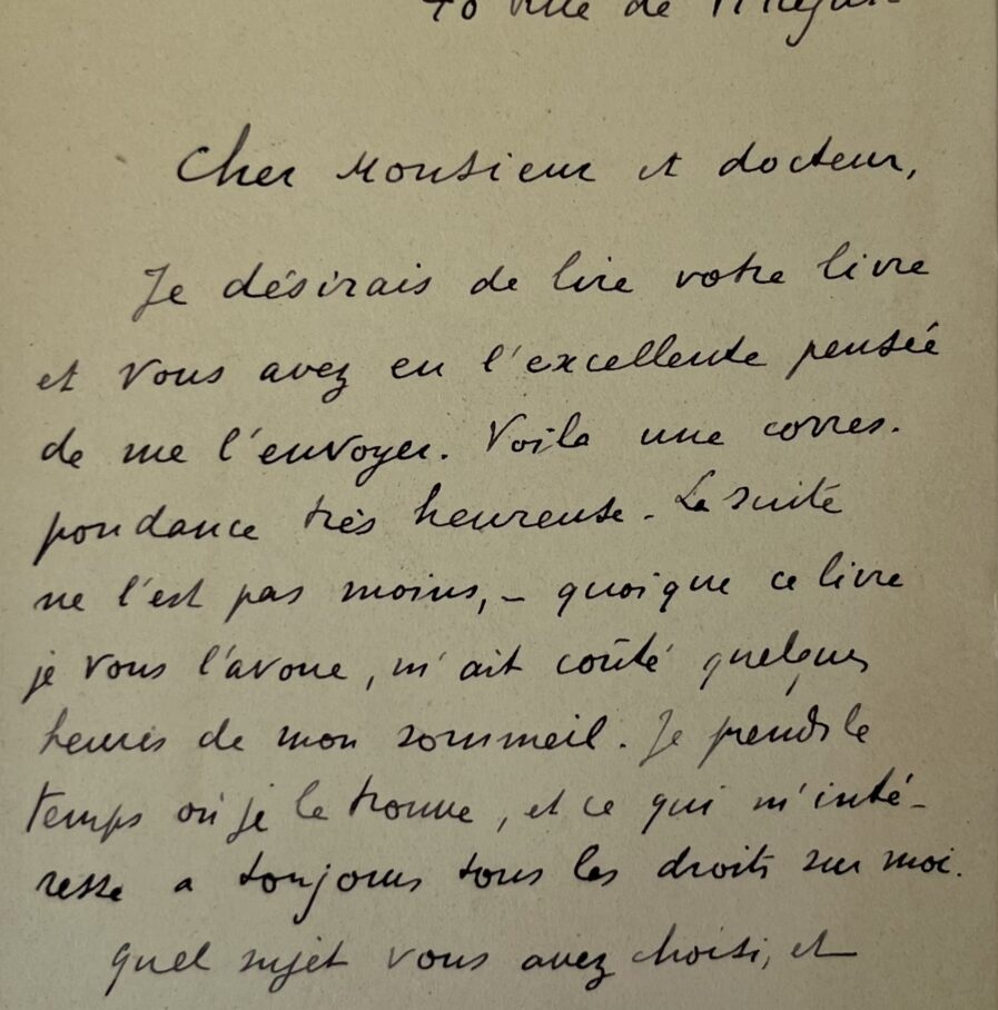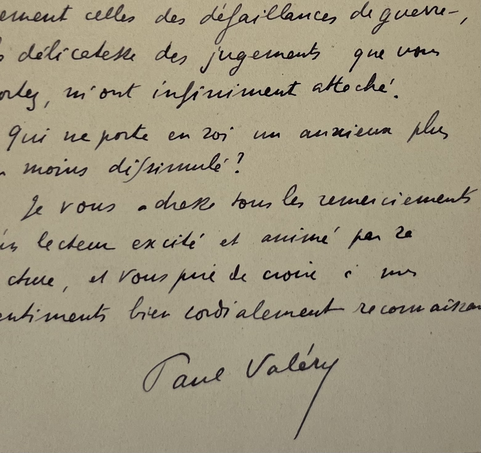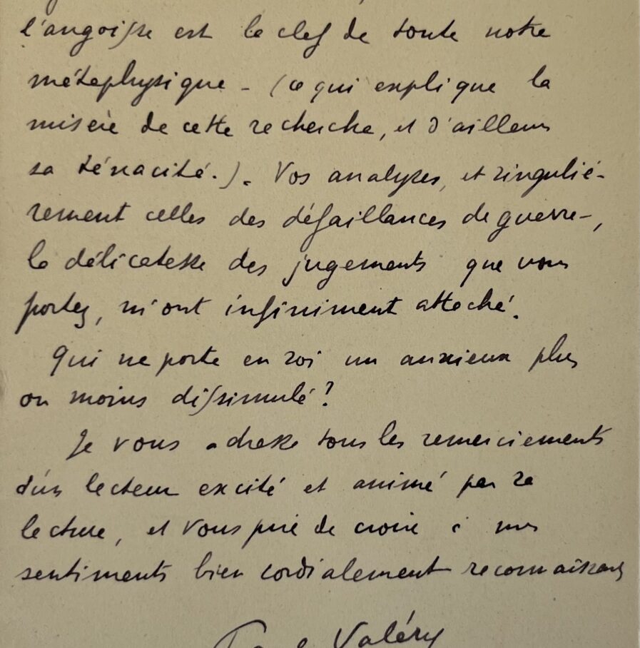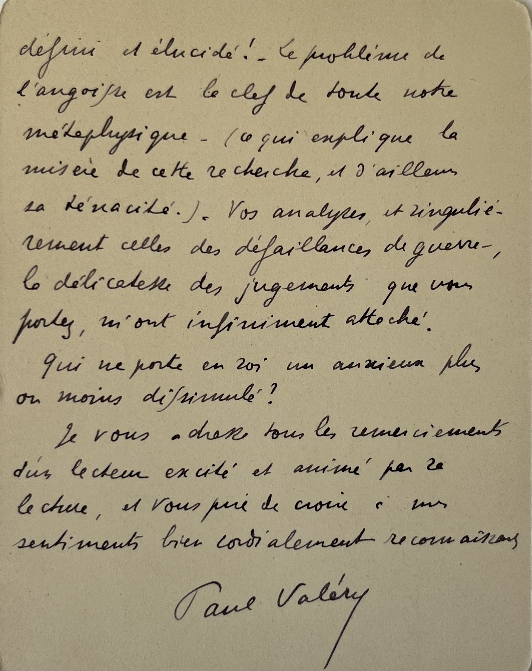 Paul Valéry (Sète, 1871/1945)"Je désirais de lire votre livre et vous avez eu l'excellente pensée de me l’envoyer. Voilà une correspondance très heureuse. La suite ne l’est pas moins, - quoique ce livre, je vous l’avoue, m’ait coûté quelques heures de mon sommeil. Je prends le temps où je le trouve, et ce qui m’intéresse a toujours tous les droits sur moi. Quel sujet vous avez choisi, et défini et élucidé ! Le problème de l’angoisse est la clé de toute notre métaphysique (ce qui explique la misère de cette recherche, et d’ailleurs, sa ténacité). Vos analyses, et singulièrement celle des défaillances de guerre, la délicatesse des jugements que vous portez, m’ont infiniment attaché. Qui ne porte en soi un anxieux plus ou moins dissimulé ? Je vous adresse tous les remerciements d'un lecteur excité et animé par sa lecture, et vous prie de croire à mes sentiments bien cordialement reconnaissant".