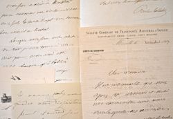 Paulin Talabot (Limoges, 1799/1885)Deux lettres de Paulin Talabot relatives aux études géologiques que son correspondant doit mener dans le sud de la France. Il lui adresse 3000 f. sur la caisse de la compagnie PLM à Marseille. "Mon frère a écrit à Rustrel pour annoncer votre visite. Si donc vous faites la course d'Apt, vous trouverez bon accueil à Rustrel. Lorsque vous ferez votre étude du Var, je vous donnerai un mot pour mon ami Mr Adolphe Chappon qui habite à Brégançon près d'Hyères et qui se met à votre disposition pour vous piloter sur le terrain qu'il connait très bien, non pas comme géologue mais comme habitant du pays [...]". Sont jointes trois lettres de Marie Talabot, son épouse, l'une avec joli en-tête orné d'une locomotive.