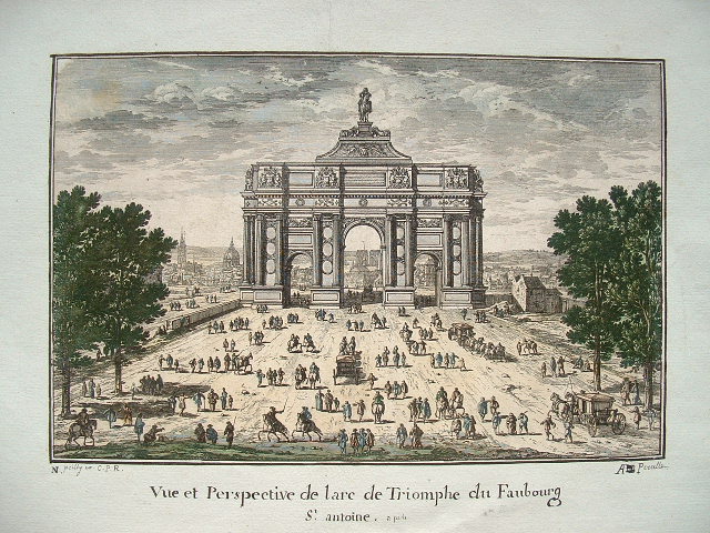 Titre manuscrit de la gravure : «Vue et perspective de l'arc de Triomphe du Faubourg St Antoine, à Paris». D'après le dessin de Poilly, gravé par Perrelle. Aquarellée dans les tons de vert et bleu.