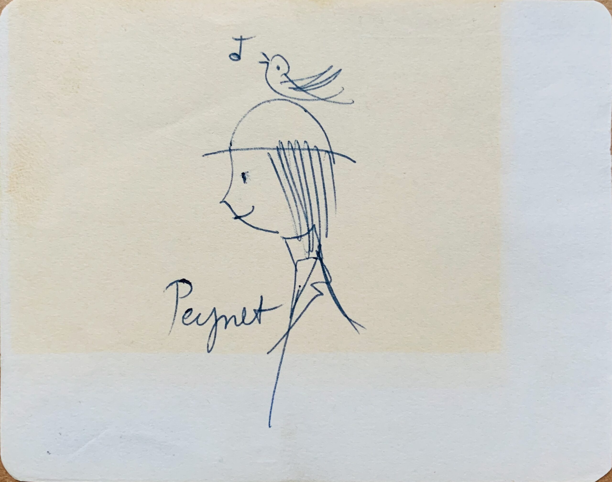 Charmant petit dessin signé Peynet, du fameux "poète" des amoureux, surmonté d'un oiseau chantant. Sur un petit feuillet aux coins arrondis.