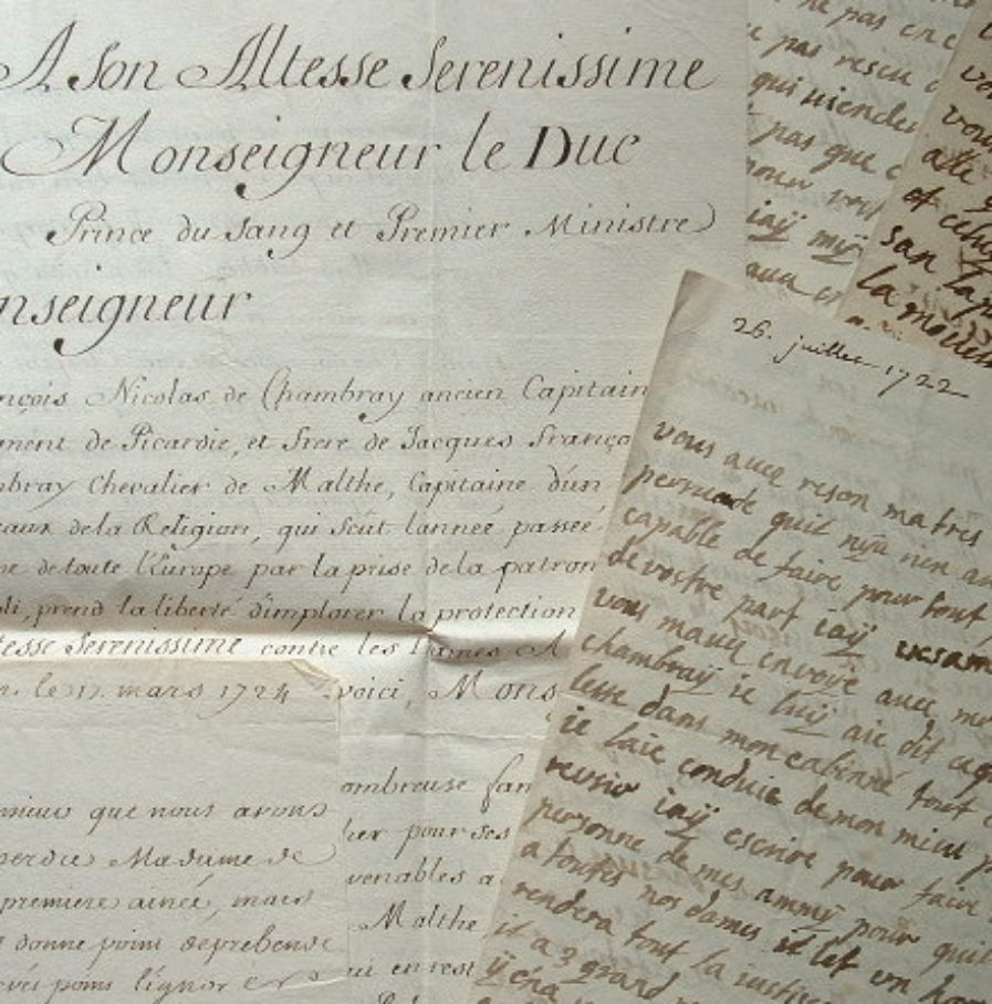 Dossier relatif à l'admission d'une jeune fille chez les chanoinesses de Denain : 7 lettres de Mmes de la Haide, de Wignacourt et de Daudion (17 pages in-4) ; supplique au duc du Bourbon (3 pp. grand in-folio) ; brouillon d'une lettre au comte de Saint-Florentin (2 pp. in-folio).