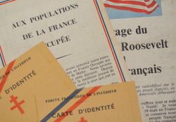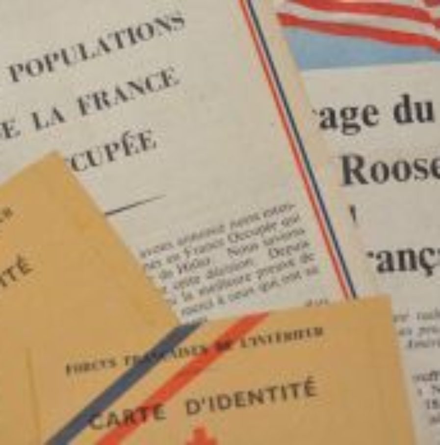 Petits dossier sur la Résistance, composé de 3 cartes d'identité vierges des FFI et 4 tracts : "Aux populations de la France occupée", "Message du président Roosevelt au Peuple Français", et 2 tracts américains destinés aux soldats allemands (différents).