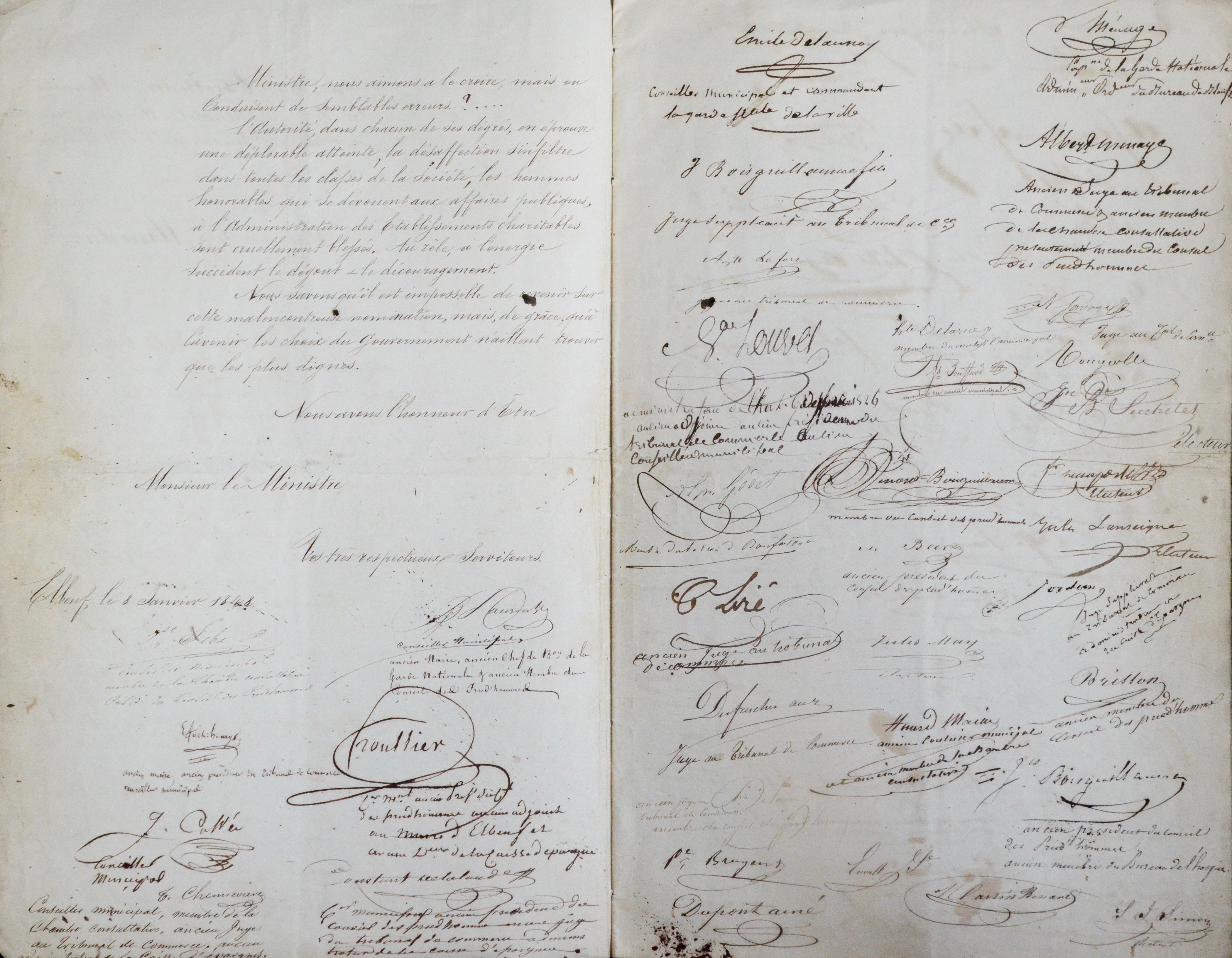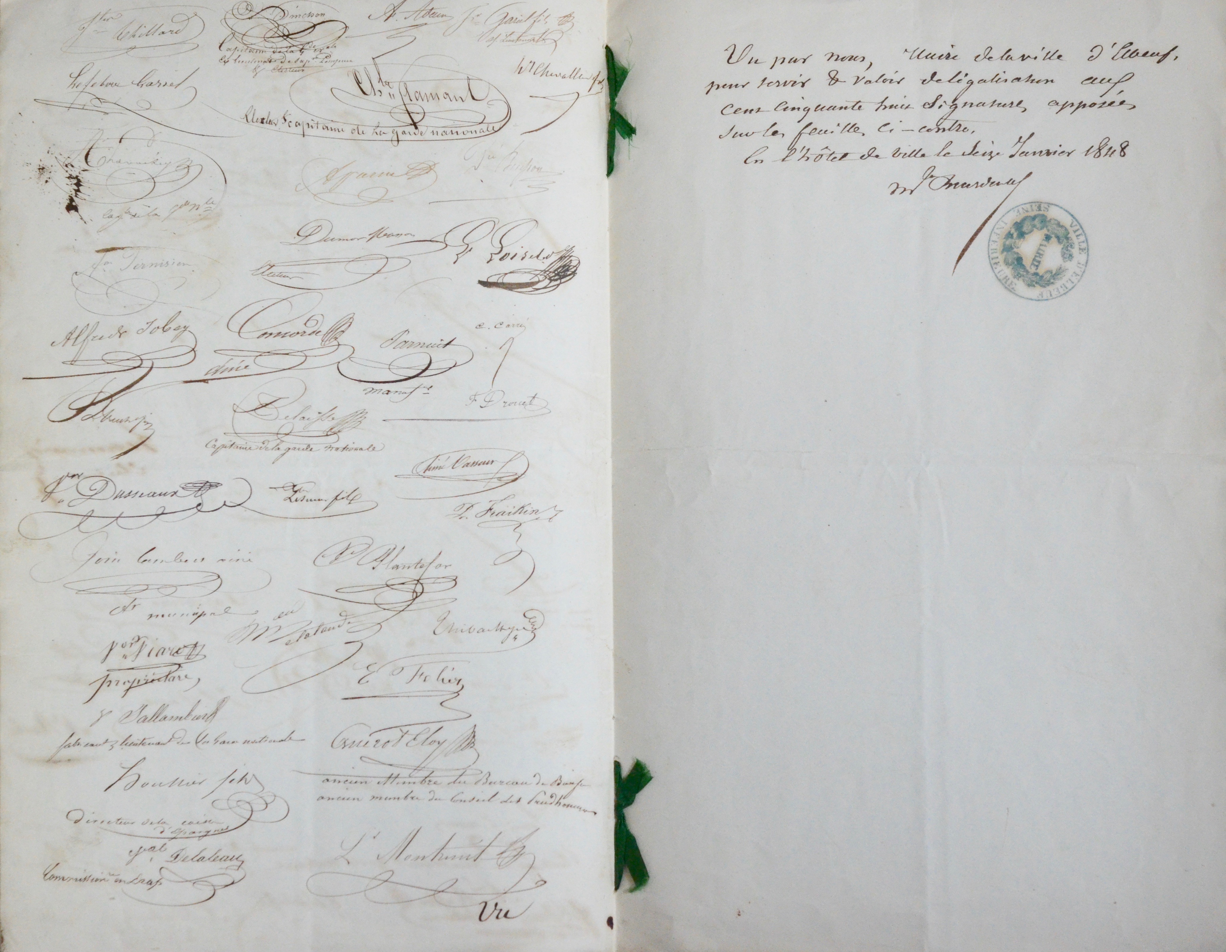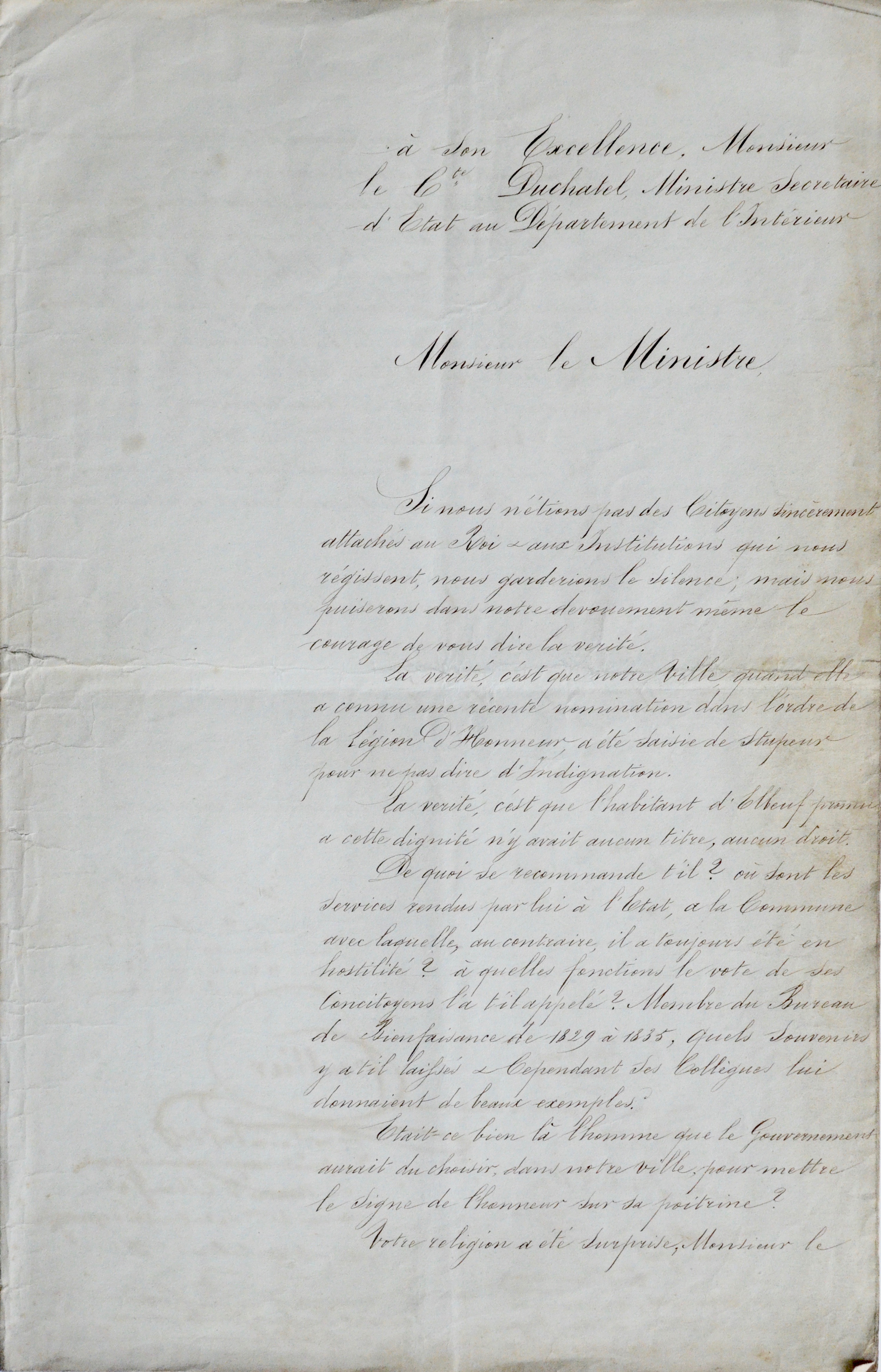 Très étonnante pétition signée par 158 citoyens d’Elbeuf (juges, anciens maires, électeurs, etc.) s’insurgeant contre la nomination d’un de ses habitants, M. Cousin, à la légion d’honneur.