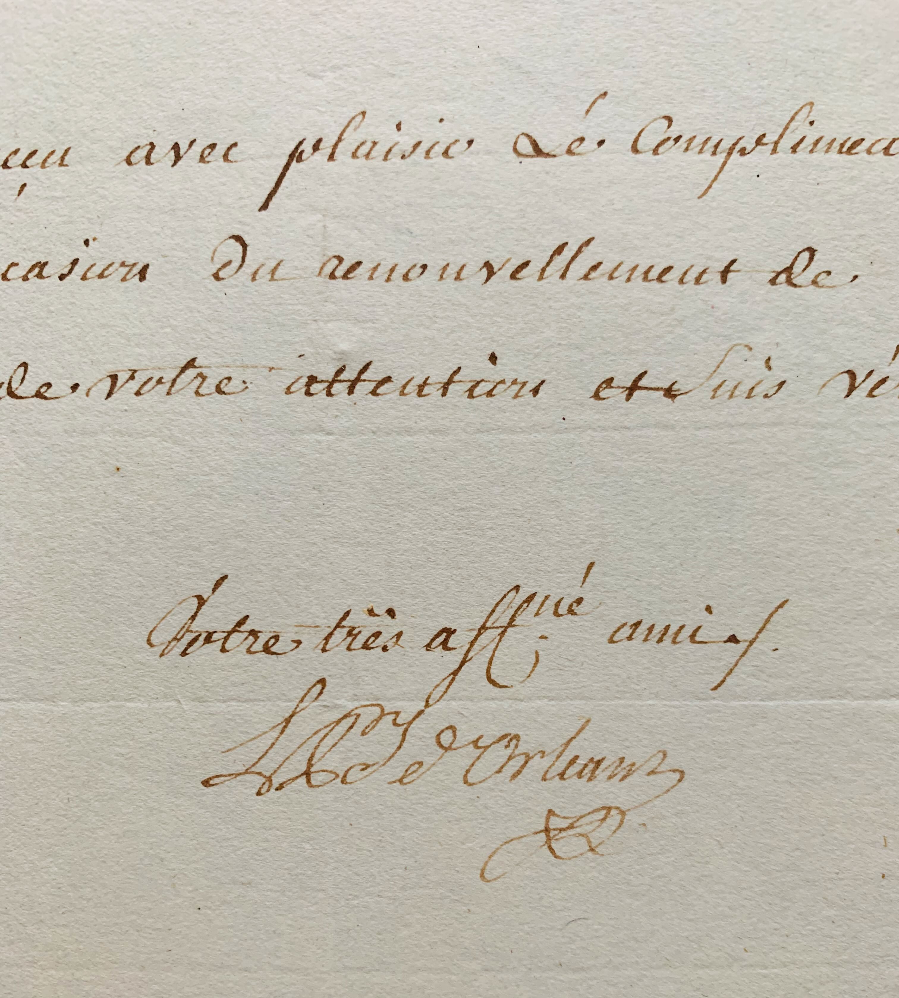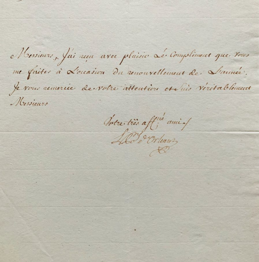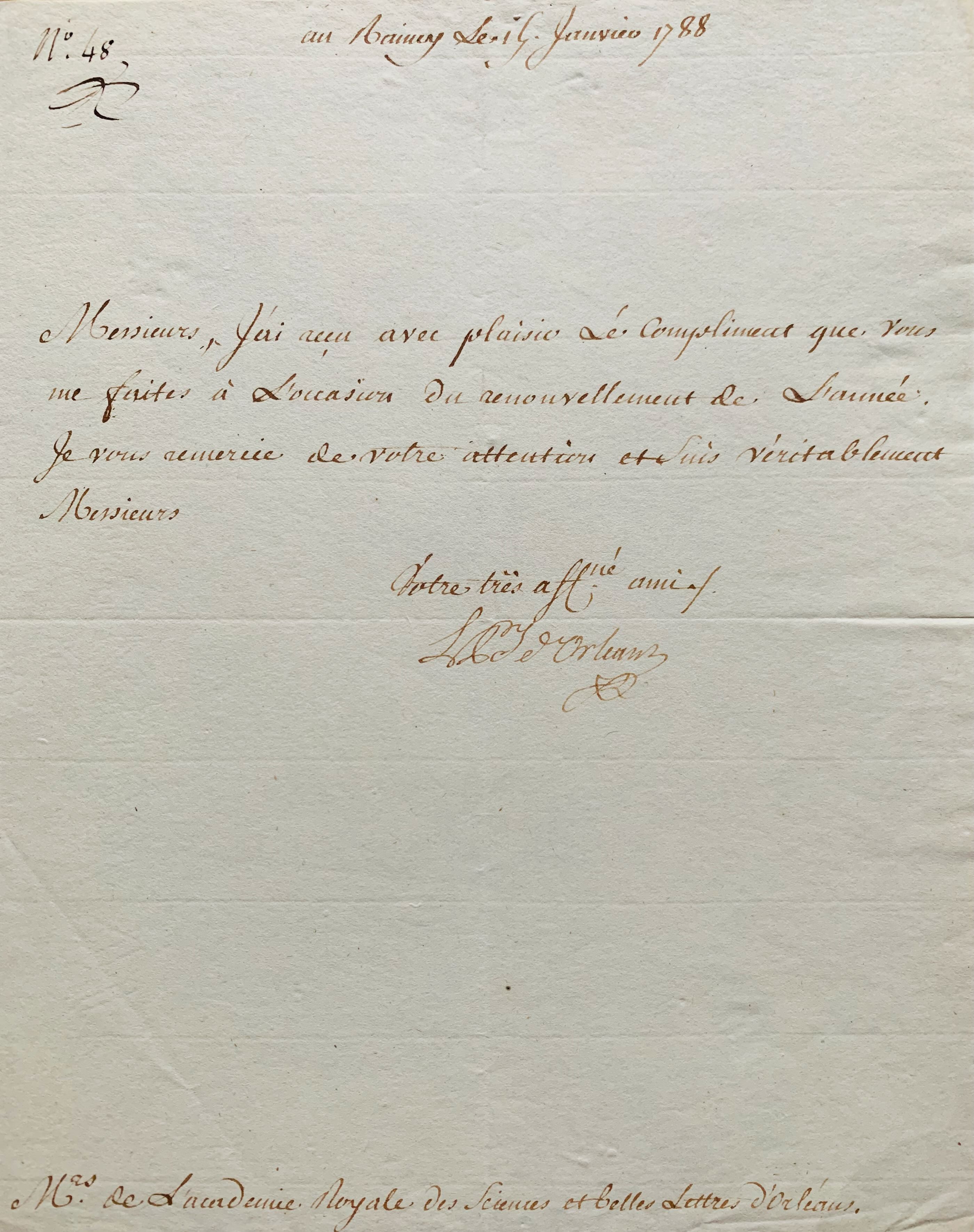 Charmante lettre de trois lignes de Louis-Philippe d'Orléans (Philippe-Egalité) à l'Académie d'Orléans.