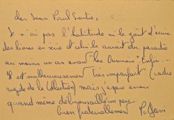 Billet plein de modestie de Philippe Gavi, journaliste et fondateur du journal Libération, à son ami Jean-Paul Sartre, probablement relatif à la publication de son ouvrage, "Le triangle indien : de Bandoeng au Bangladesh", publié en 1972 au Seuil, dans la collection Combats. "Je n'ai pas l'habitude ni le goût d'écrire des livres en série et celui là aurait dû paraître au moins un an avant « Les Ouvriers », enfin ... Il est malheureusement très imparfait (cadre rigide de la collection) mais j'espère avoir quand même débroussaillé un peu. Bien fraternellement". [Philippe Gavi, co-signera avec Sartre, deux ans plus tard, l'ouvrage "On a raison de se révolter"].