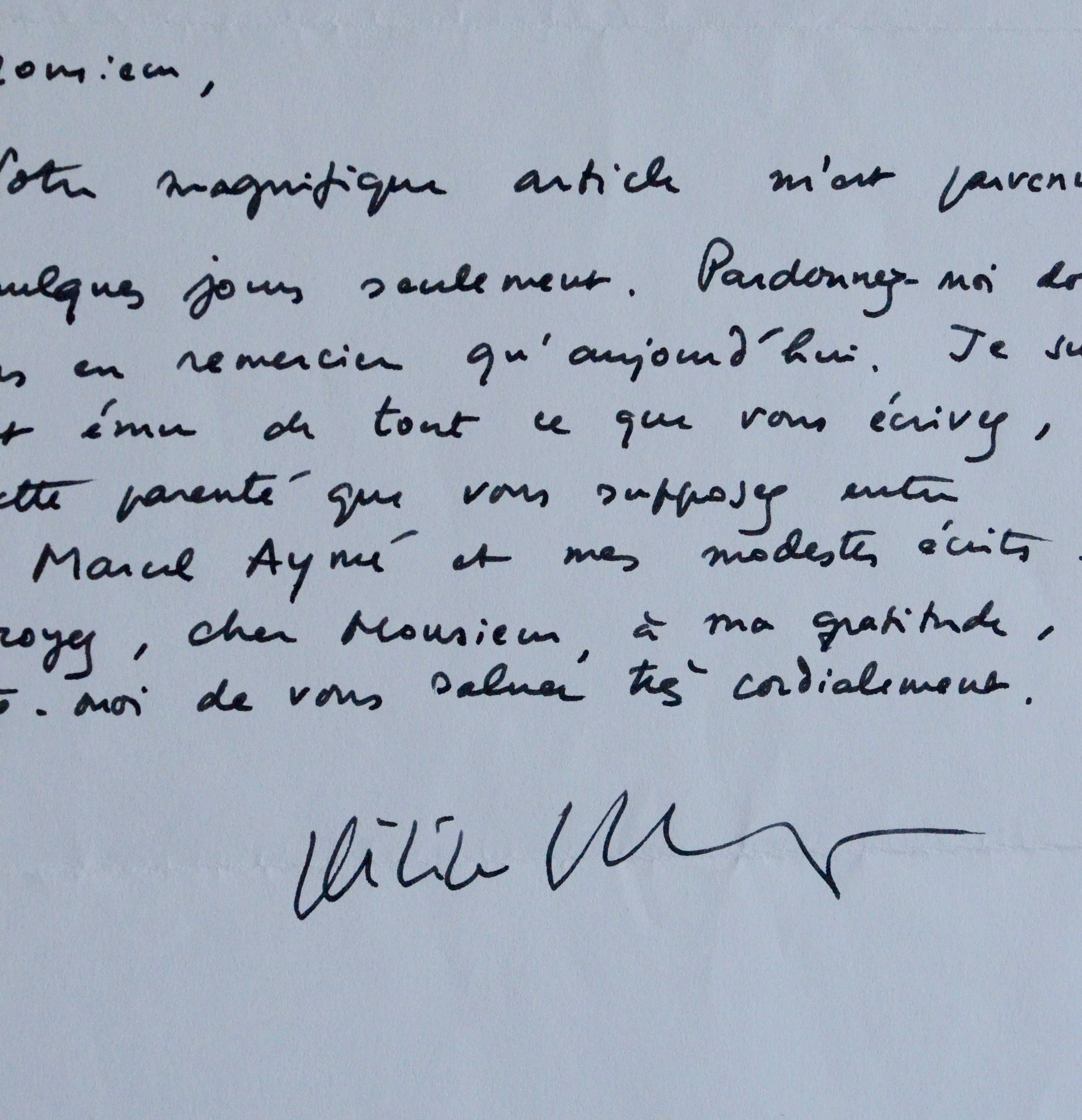 "Votre magnifique article m'est parvenu il y a quelques jours seulement. Pardonnez-moi de ne vous en remercier qu'aujourd'hui. Je suis profondément ému de tout ce que vous m'écrivez, de cette parenté que vous supposez entre l'immense Marcel Aymé et mes modestes écrits. Croyez, cher Monsieur, [...] à ma gratitude [...]".