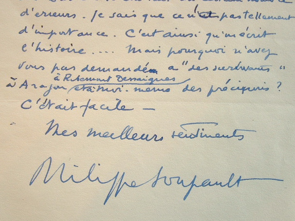 Il a lu l'article paru dans France Soir sur Dada. «Il contient un certain nombre d'erreurs. Je sais que ce n'a pas tellement d'importance. C'est ainsi qu'on écrit l'histoire... Mais pourquoi n'avez-vous pas demandé à "des survivants", à Aragon, à Ribemont-Dessaignes, et à moi-même des précisions ? C'était facile [...]».