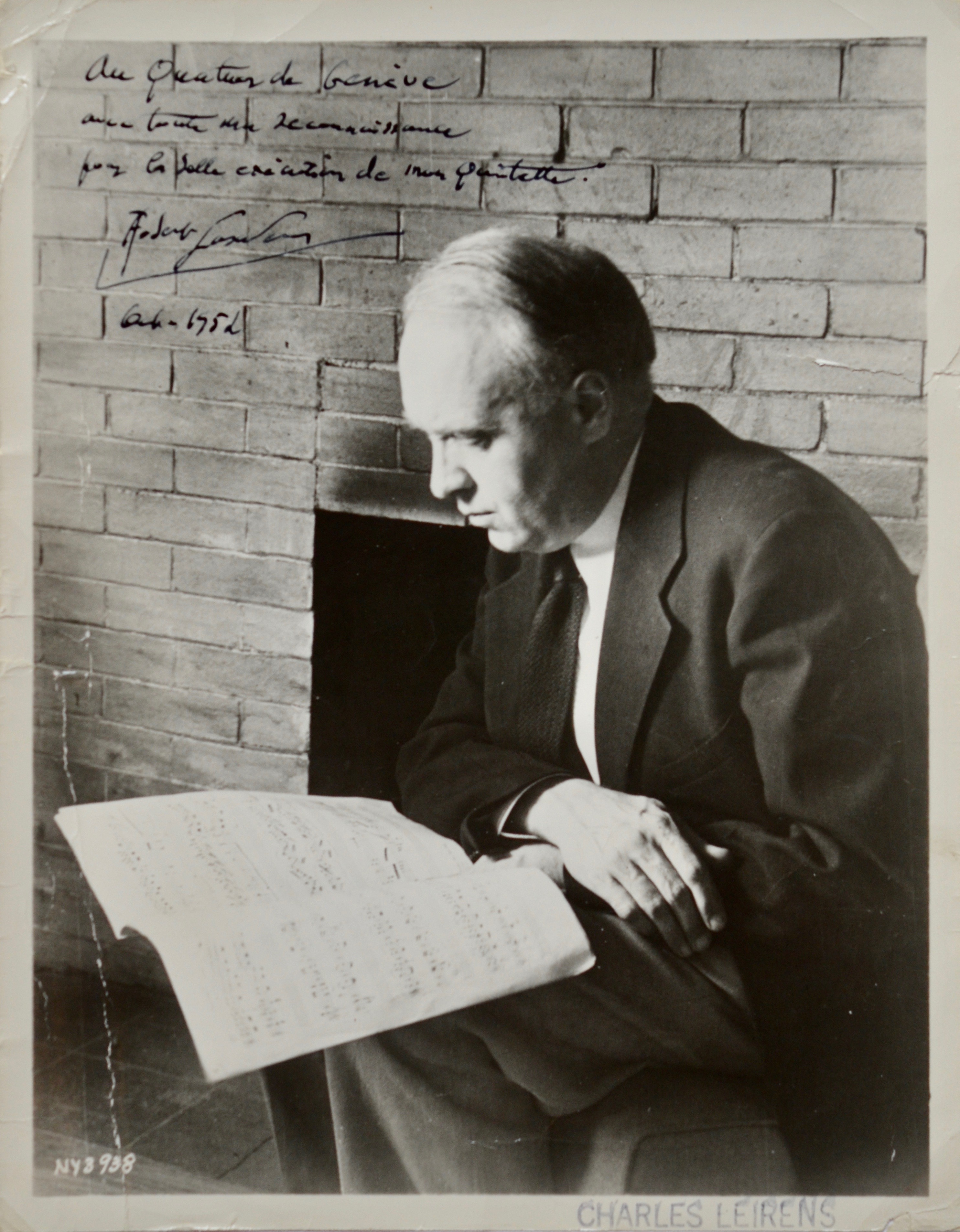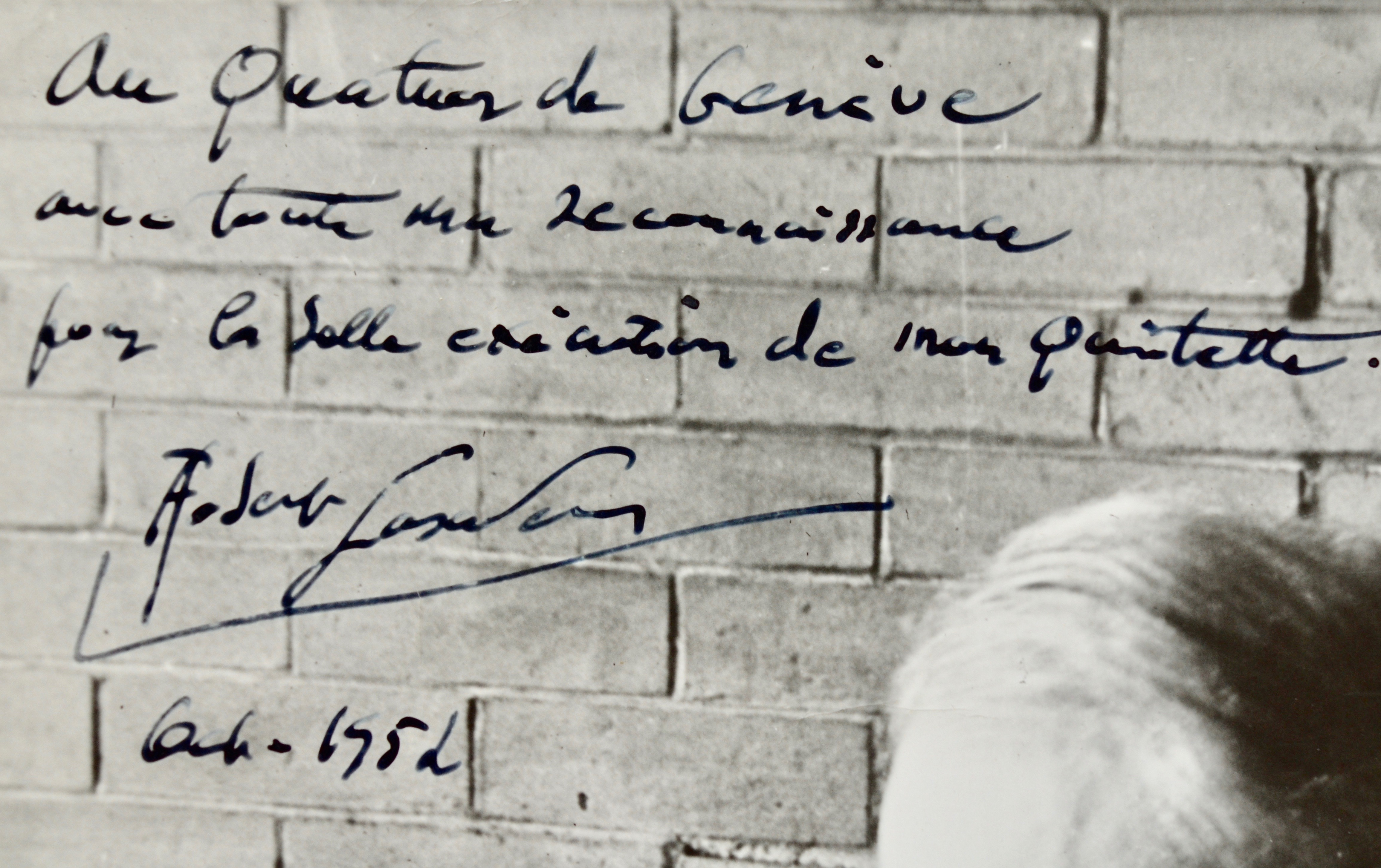 Belle photo du compositeur Robert Casadesus lisant une partition (cliché Charles Leirens) avec cette dédicace : "au quatuor de Genève, avec toute ma reconnaissance pour la belle exécution de mon quintette. Robert Casadesus. Octobre 1952".