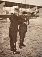 Photographie originale représentant l'aviateur Henri Farman, en compagnie d'un général, devant son aéroplane.