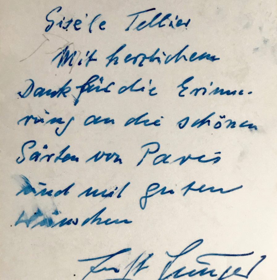 "à Gisèle Tellier. Mit herzlichen Dank für die Erinnerung an die schönen Gärten von Paris und mit guten Wünschen [...]".