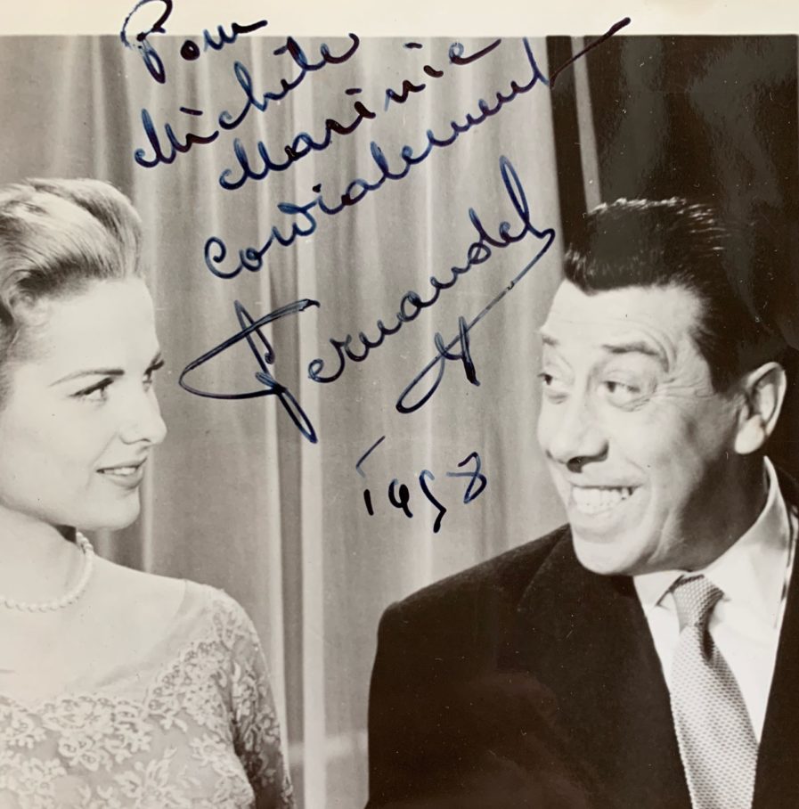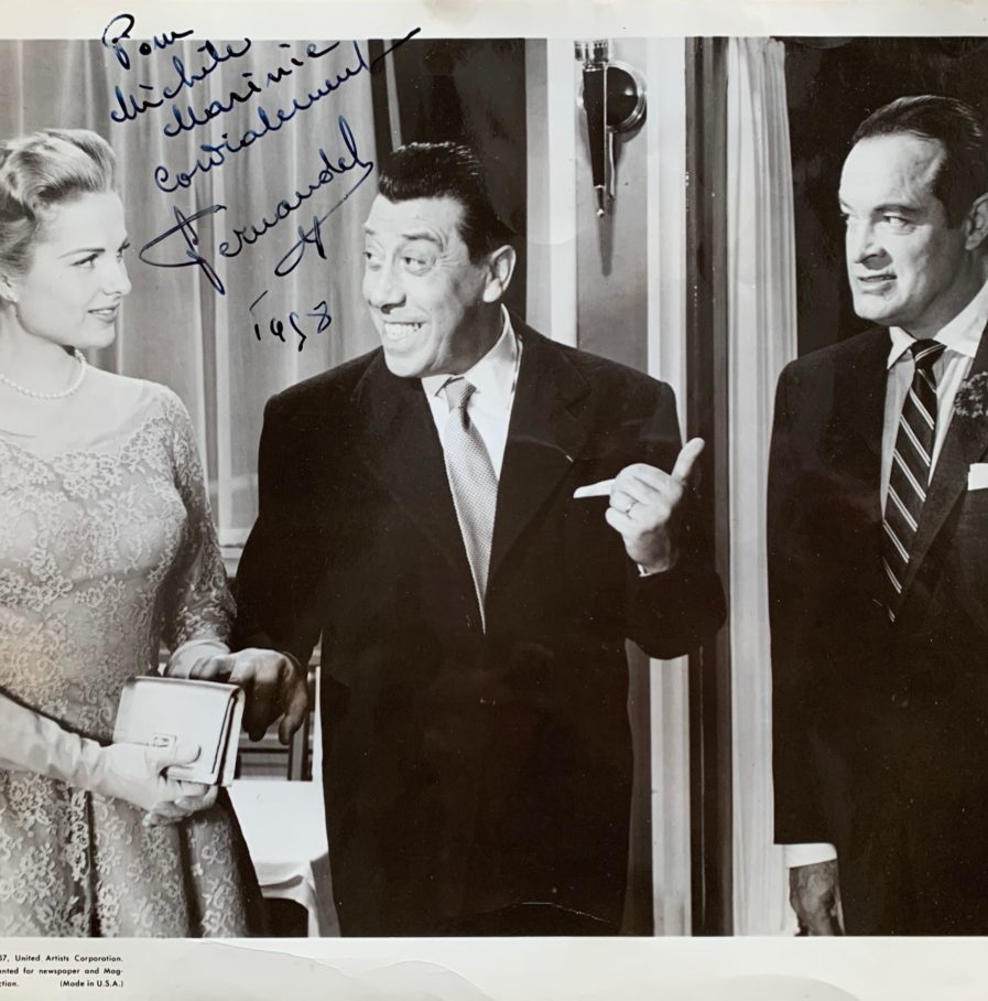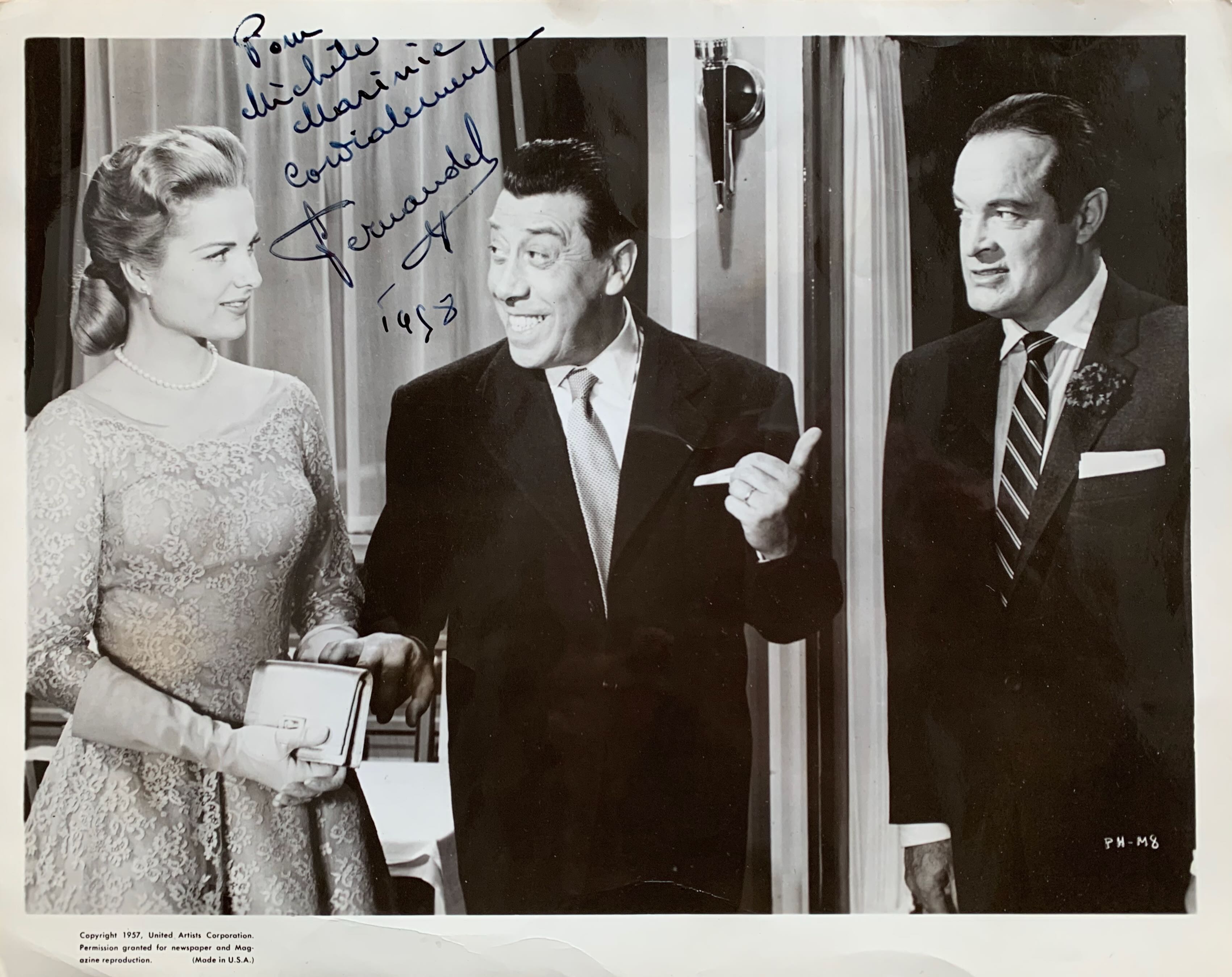 Photographie d'exploitation du film franco-américain "À Paris tous les deux" (sortie en France en 1958), dédicacée par son acteur principal, Fernandel : "Pour Michèle Marinie, cordialement. Fernandel. 1958".