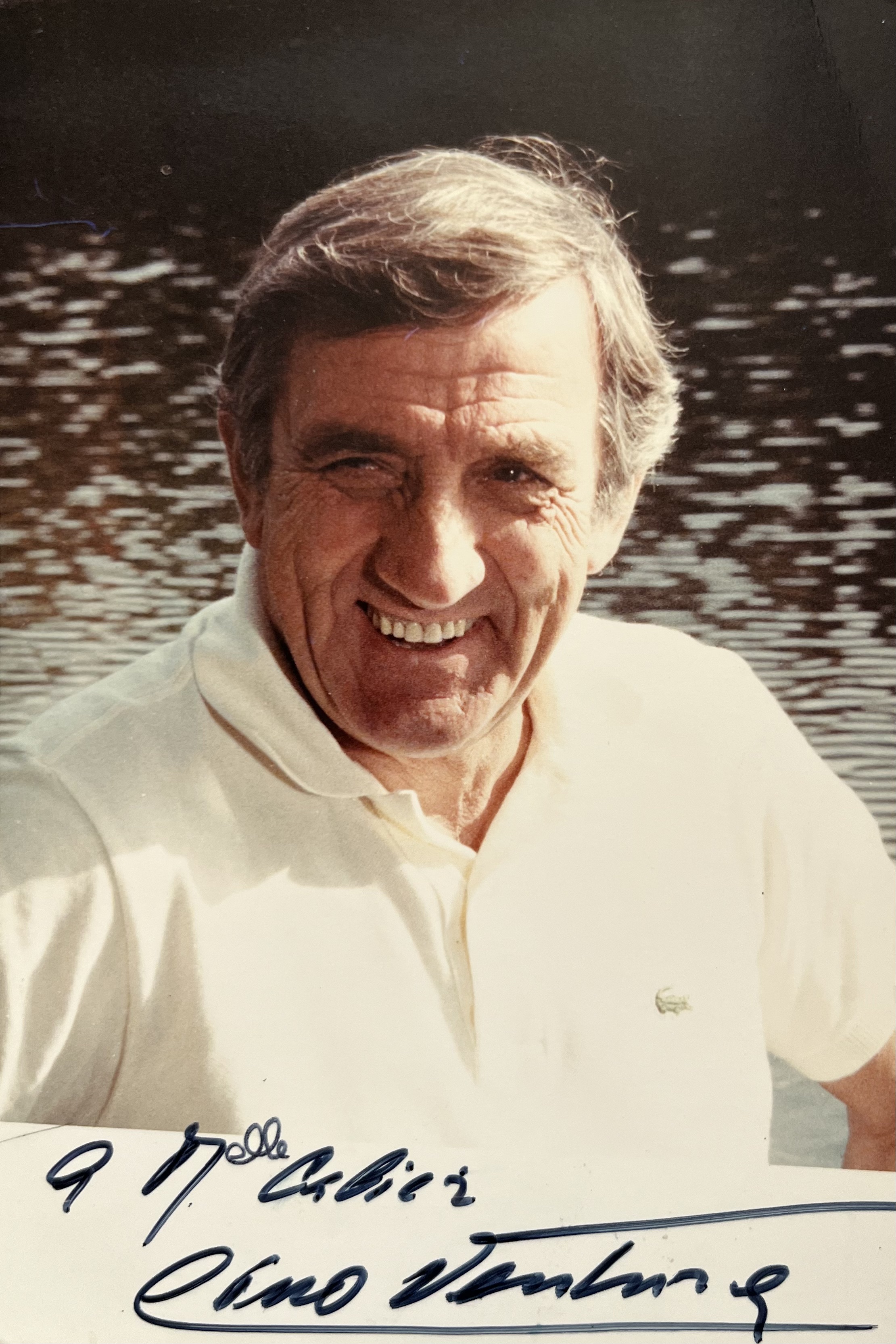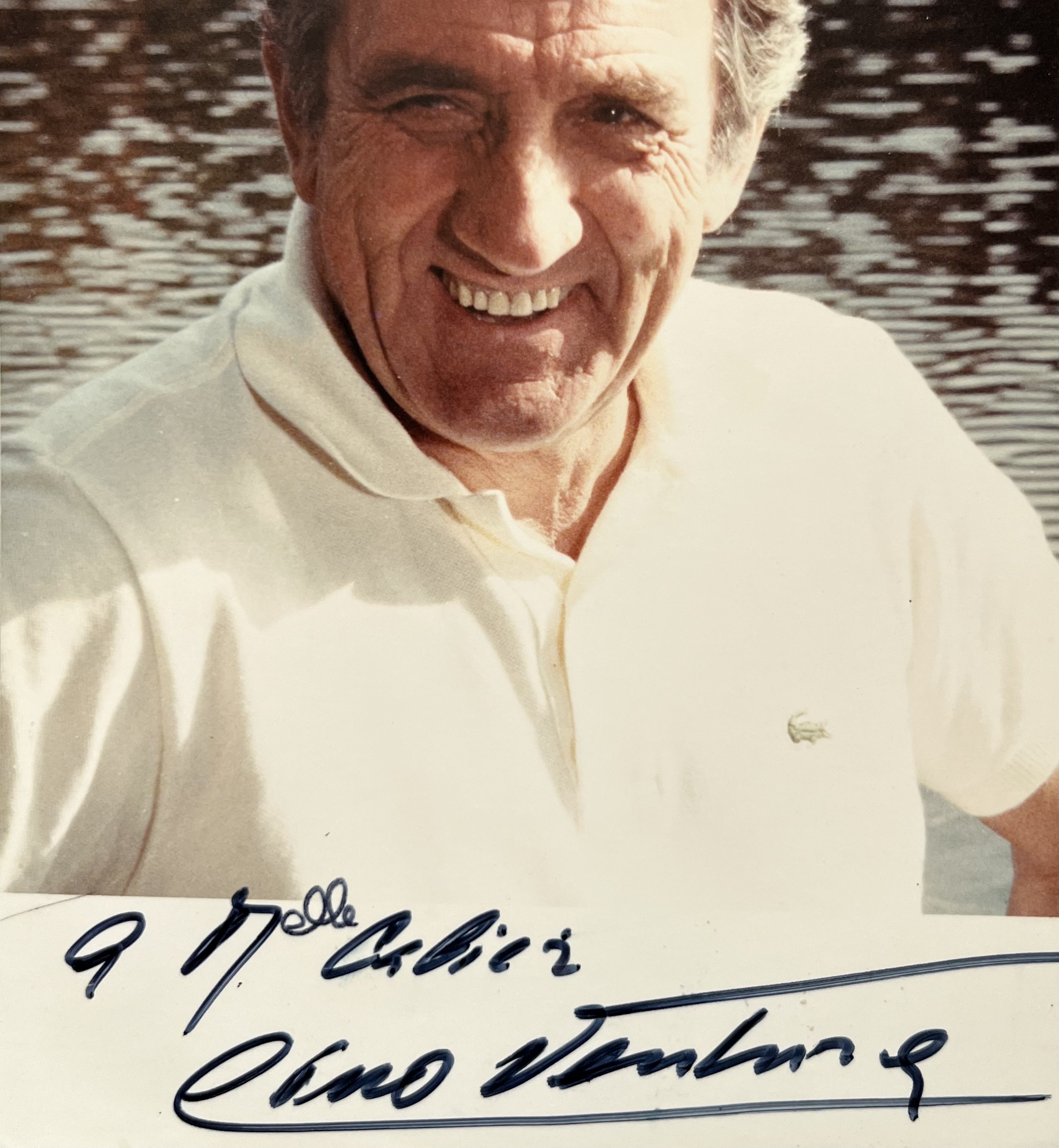 Photographie originale de Lino Ventura (portrait en buste), dédicacée : "à Melle Cabier Lino Ventura".