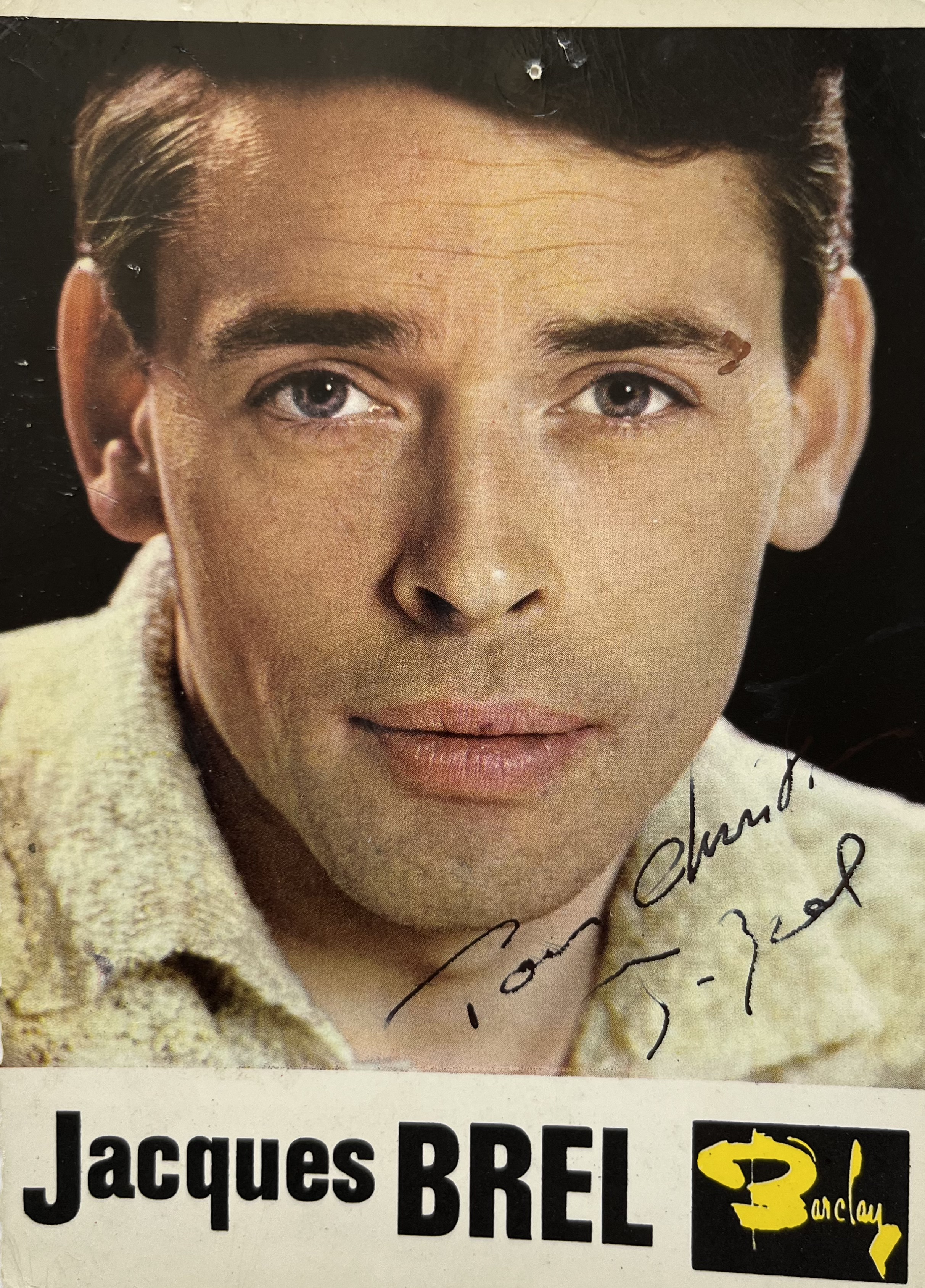 Portrait de Jacques Brel sous forme de carte promotionnelle imprimée par son producteur Barclay.