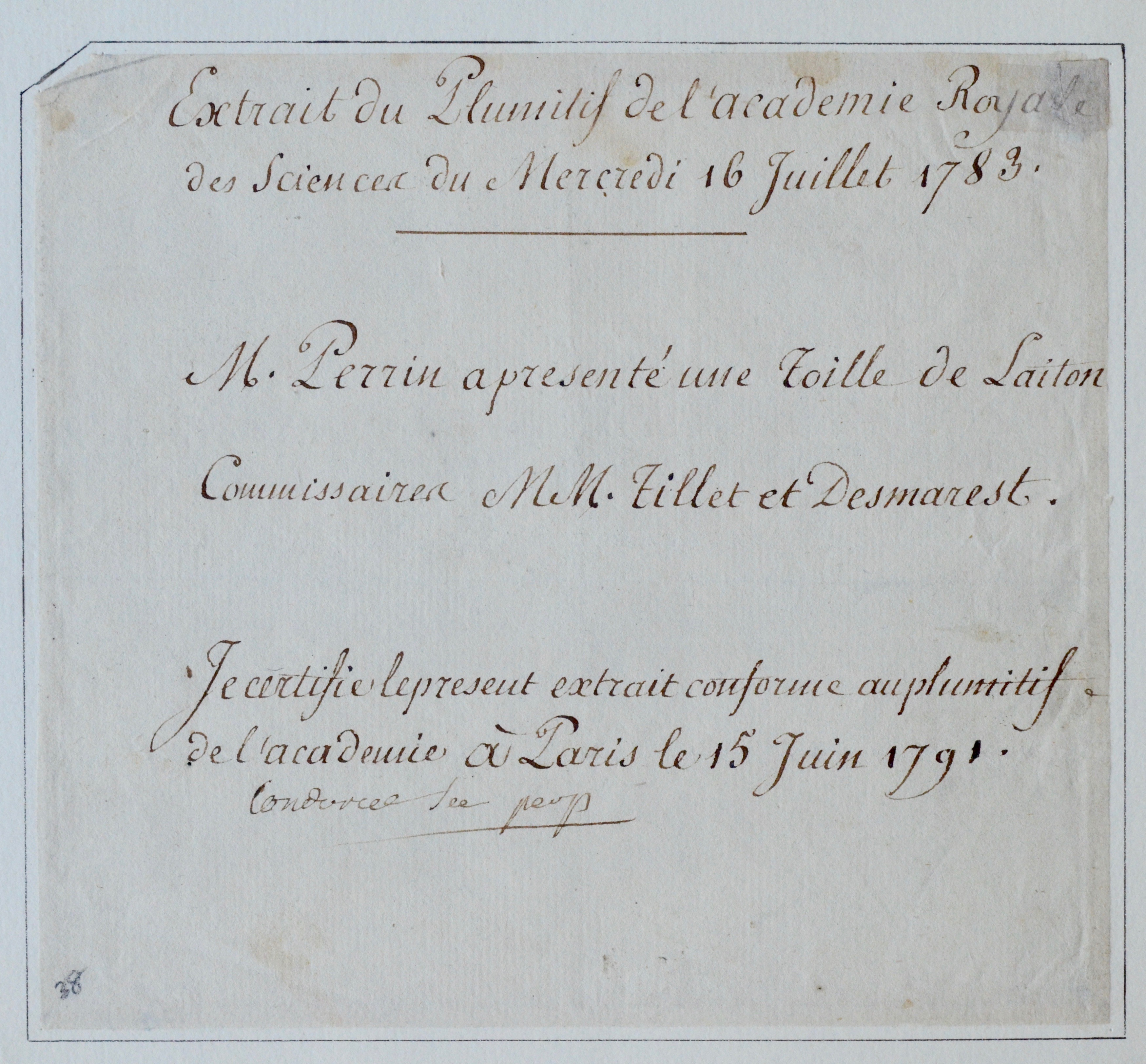 "Extrait du Plumitif [registre d'audience] de l'académie Royale des Sciences du Mercredi 16 juillet 1783.