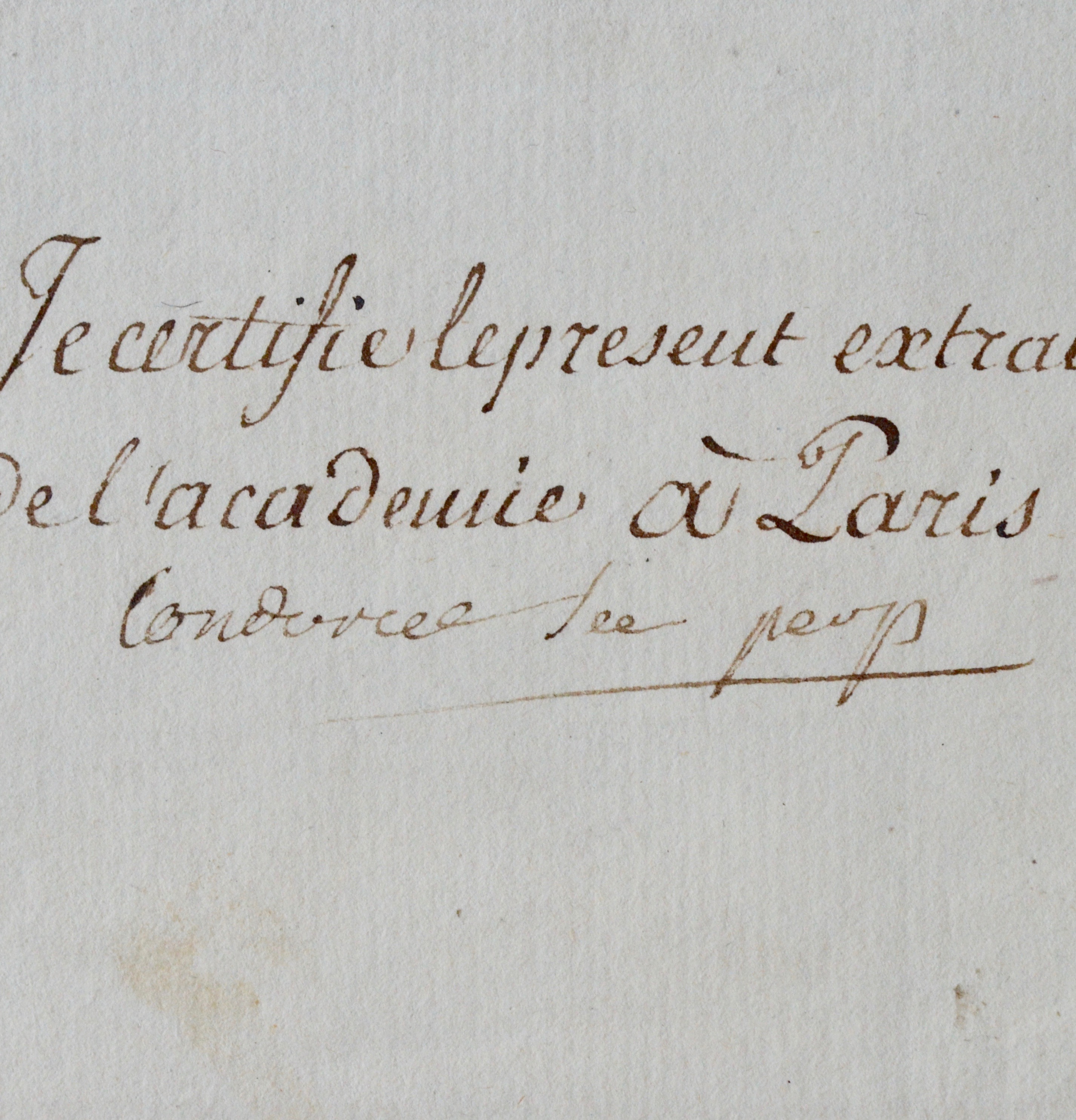 Je certifie le présent extrait conforme au plumitif de l'Académie à Paris le 15 juin 1791 [...]".