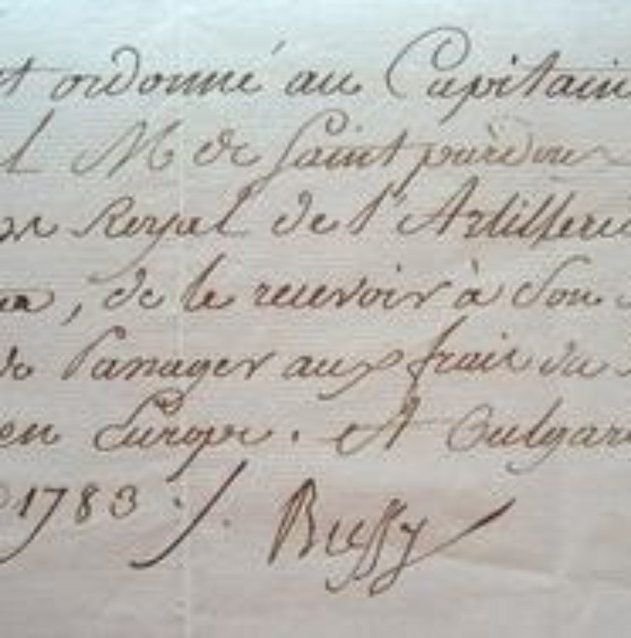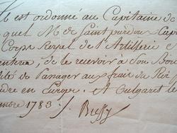 Ordre donné à un capitaine de vaisseau d'embarquer M. de Saint-Pardon, capitaine du corps royal d'artillerie, «de le recevoir à son bord en qualité de passager aux frais du Roi pour le rendre en Europe».