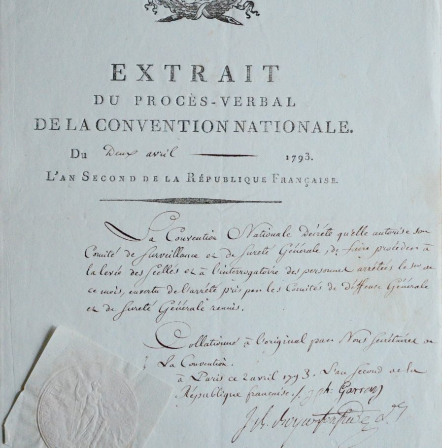 "La Convention nationale décrète qu'elle autorise son Comité de surveillance et de Sureté générale, de faire procéder à la levée des scellés et à l'interrogation des personnes arrêtées le 1er de ce mois [...]"