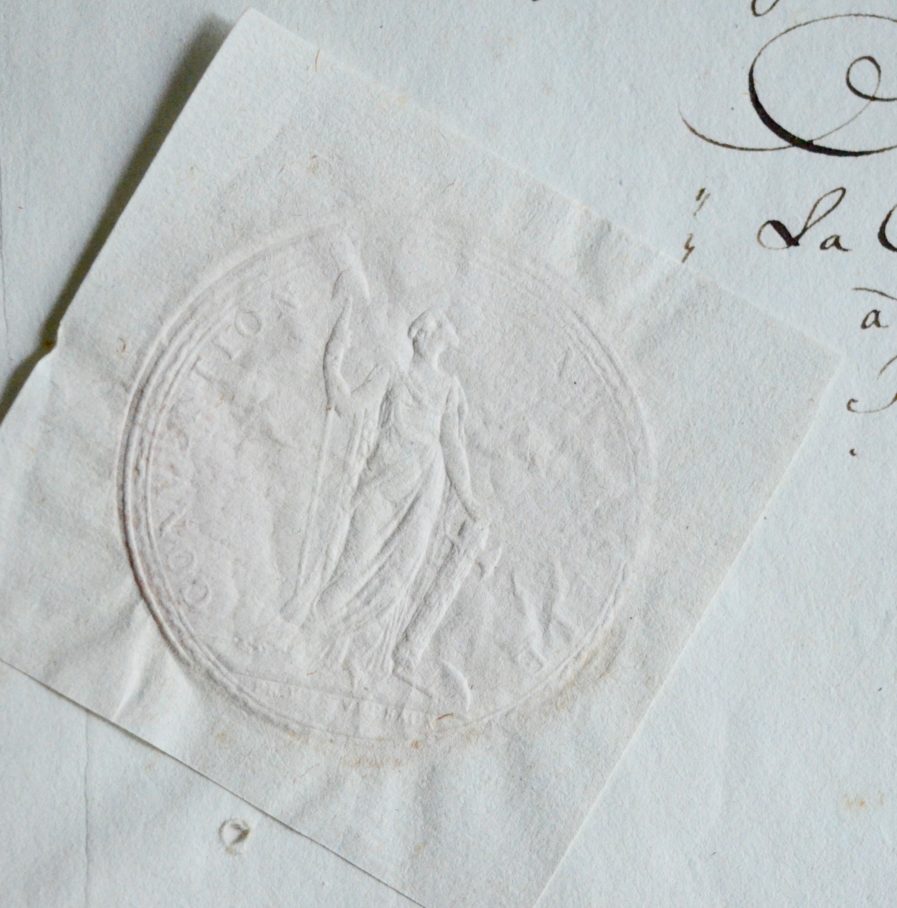 Encre brune sur papier vergé filigrané "D&C Blauw". En-tête de la Convention nationale imprimé et illustré d'une belle vignette datée de 1792, figurant une couronne de feuilles de chêne. Beau sceau sous papier.