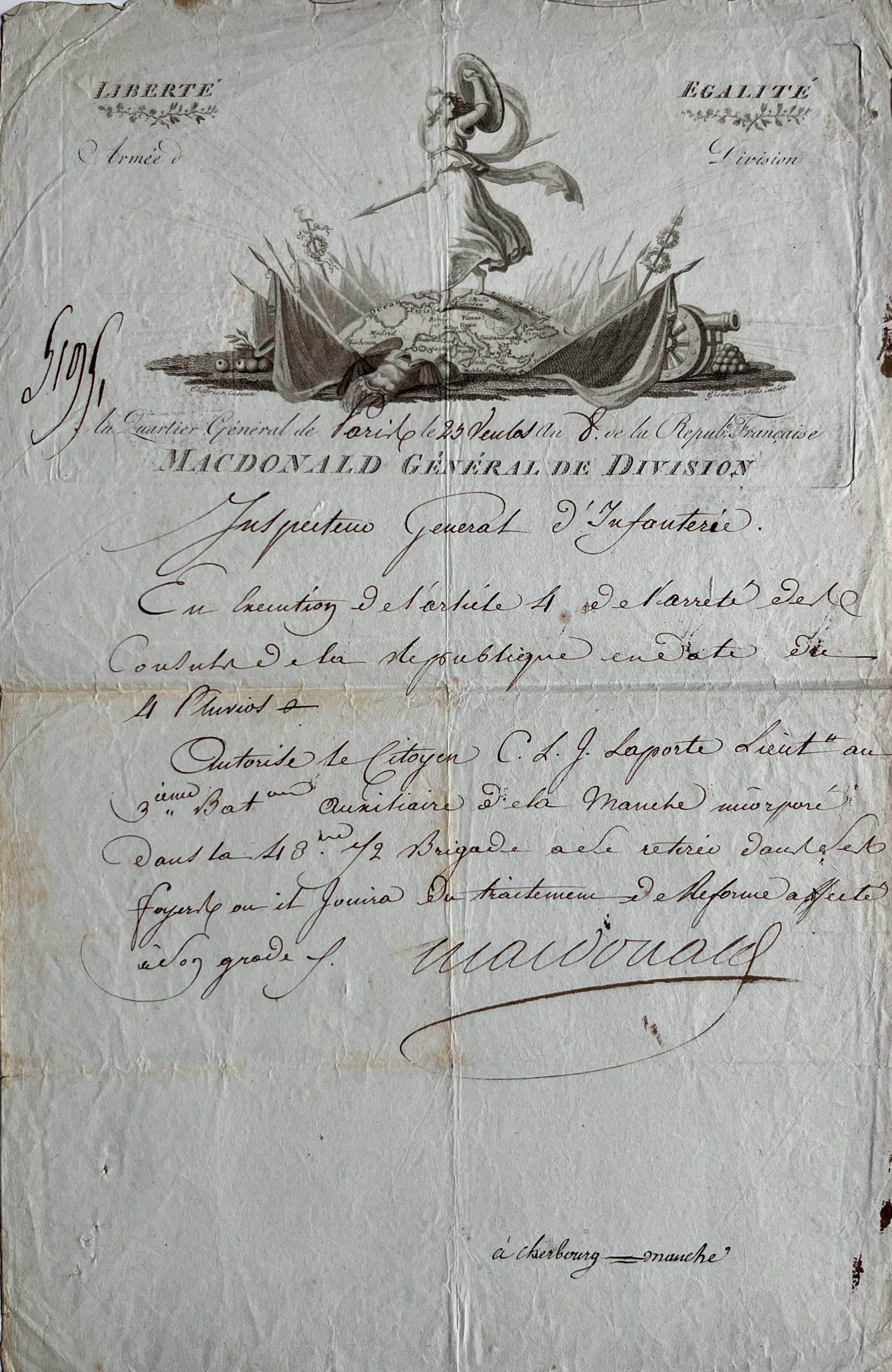 Pièce signée par le général de la Révolution (futur maréchal d'Empire) Étienne Macdonald, illustrée d'une grande et superbe vignette signée Auguste-Firmin Chabrier (1773-1812), reproduite dans Boppe et Bonnet (n° 137 p. 91).