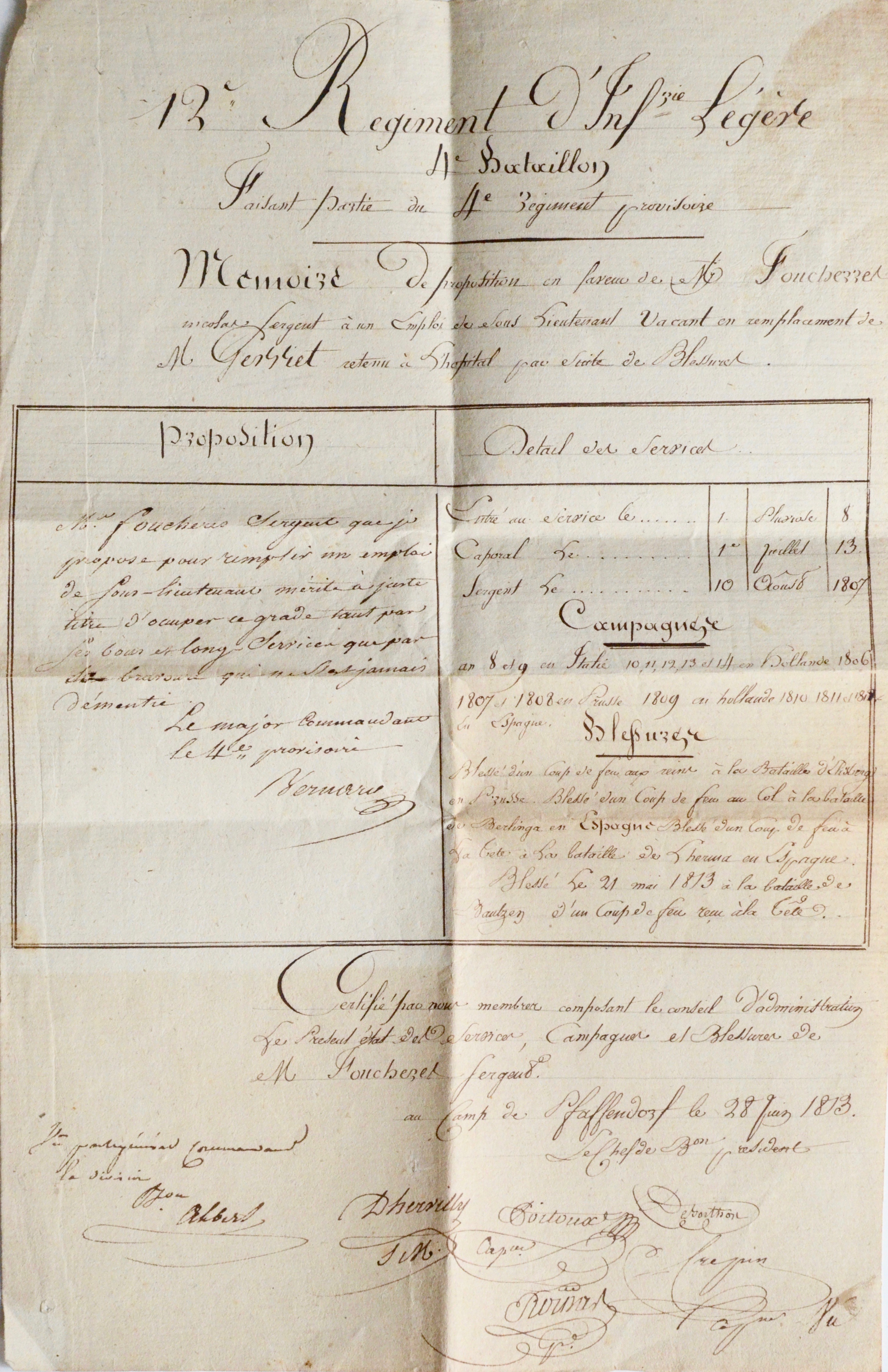 États de service et nomination du sergent Nicolas Fouchères en remplacement de son prédécesseur blessé.