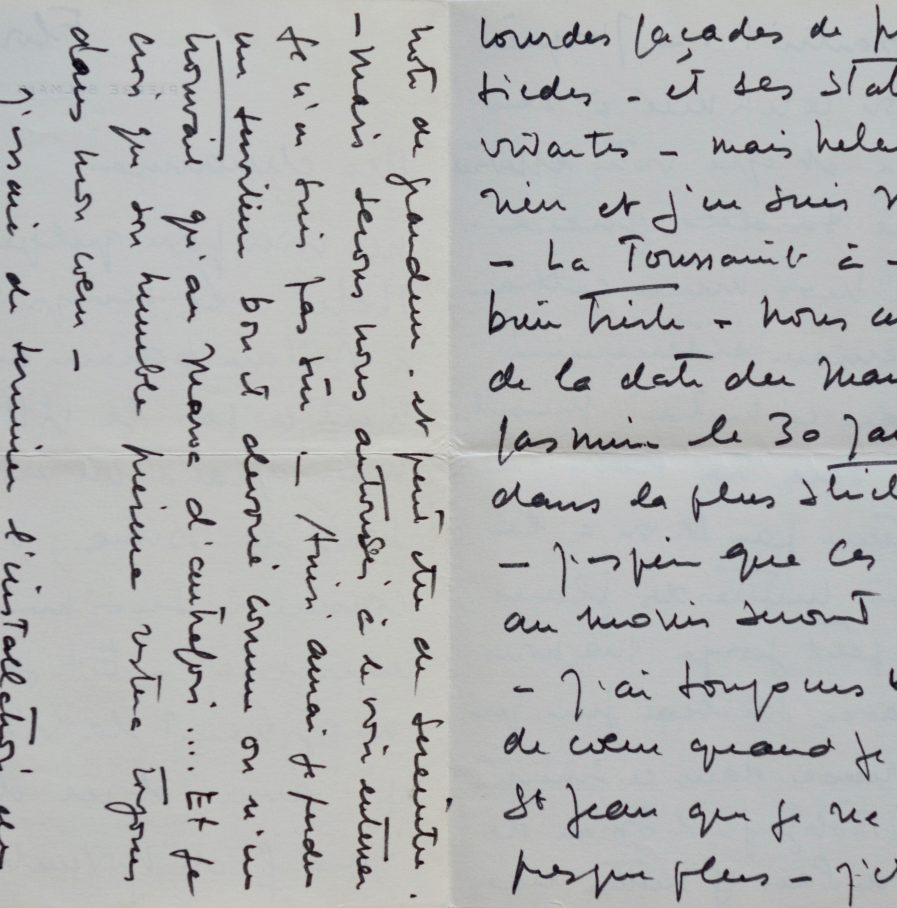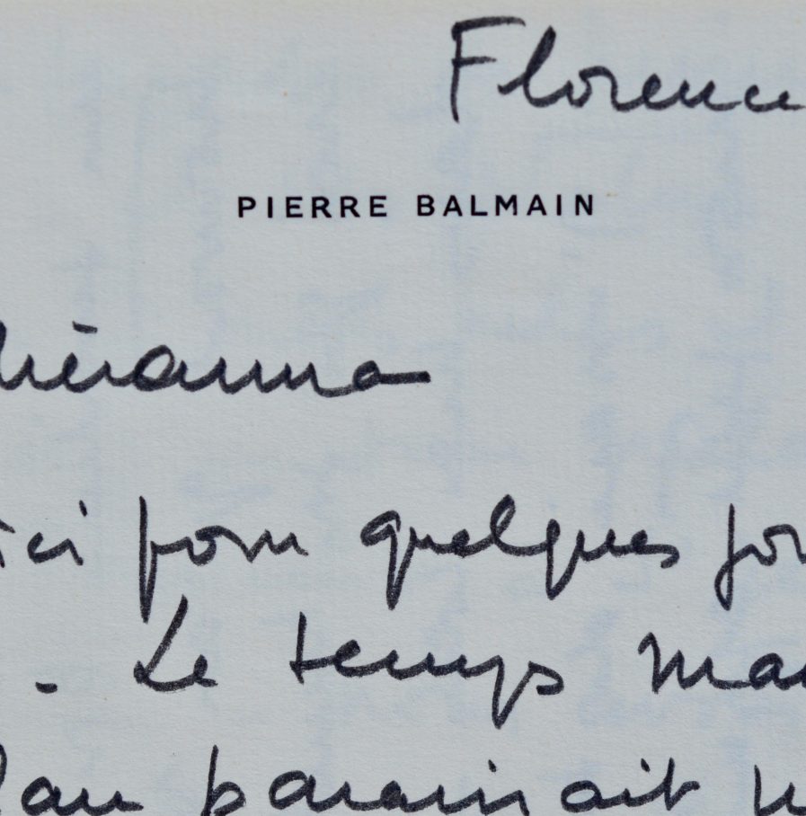 Pierre Balmain (Saint-Jean-de-Maurienne, 1914/1982)Emouvante lettre de Pierre Balmain, empreinte de nostalgie quand il évoque sa ville de naissance, Saint-Jean-de-Maurienne, et de mélancolie, au moment des obsèques de son serviteur marocain Nacer. "Me voici pour quelques jours en Italie. Le temps maussade à Milan paraissait normal, n'est-ce pas la ville du brouillard, mais quand on est à Florence sous la bruine, on en éprouve comme le sentiment d'une injustice. Et je me vais imaginant la ville comme je l'aime, dorée au soleil tardif de novembre, toutes ses lourdes façades de pierre encore tièdes - et ses statues comme vivantes - mais hélas il n'en est rien et j'en suis mélancolique. La Toussaint à St Jean fut bien triste [...]. J'ai toujours un serrement de coeur quand je retourne à St Jean que je ne reconnais presque plus. J'étais presque soulagé de partir!... [...]. Je rentre moi-même cette nuit. Demain enterrement de Nacer au cimetière musulman. Ce sera très triste. Je ne sais même pas si on a le droit de lui mettre des fleurs. Je vois le petit groupe que nous formerons, avec son beau-frère qui vient du Maroc dans ce sinistre faubourg de Bobigny. L'Imam de la Mosquée de Paris y mettra une note de grandeur - et peut-être de sérénité - mais serons nous autorisés à le voir enterrer, je n'en suis pas sûr. Ainsi aurai-je perdu un serviteur bon et dévoué comme on en trouvait qu'au Maroc d'autrefois... Et je crois que son humble présence restera toujours dans mon coeur [...]".