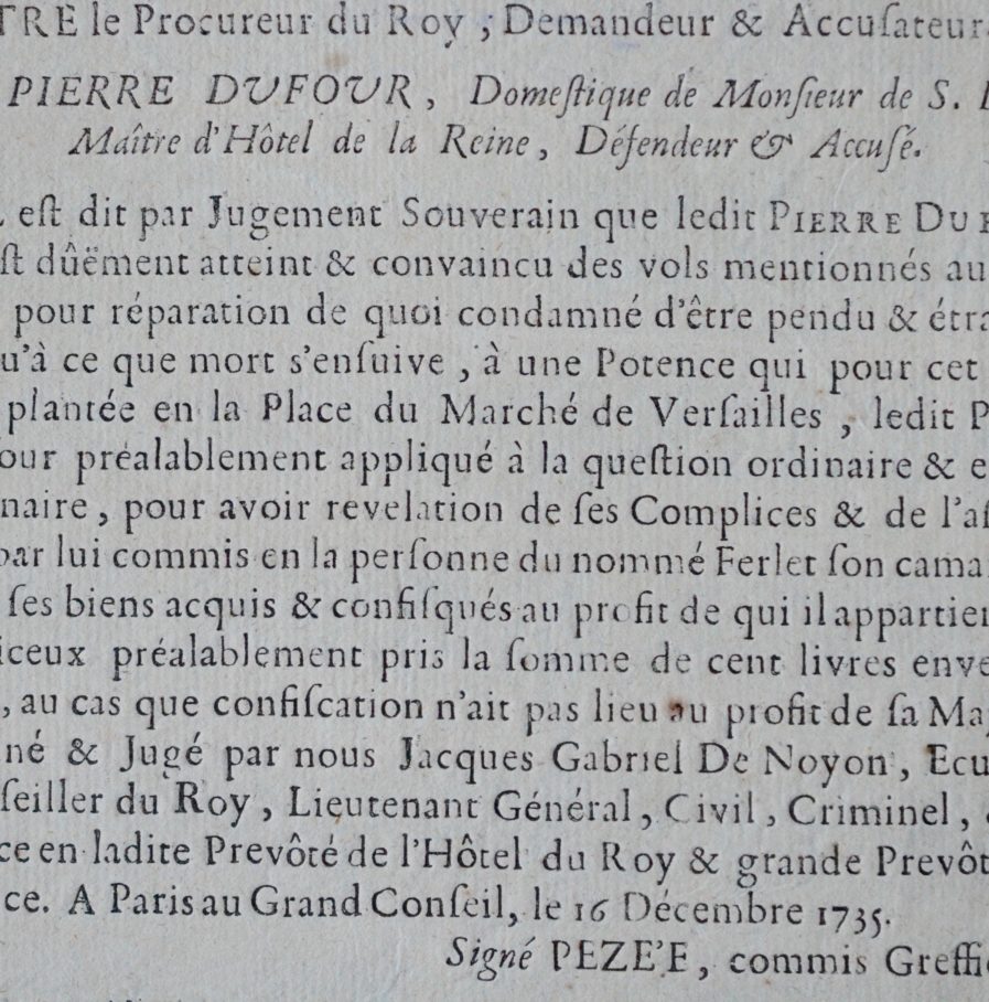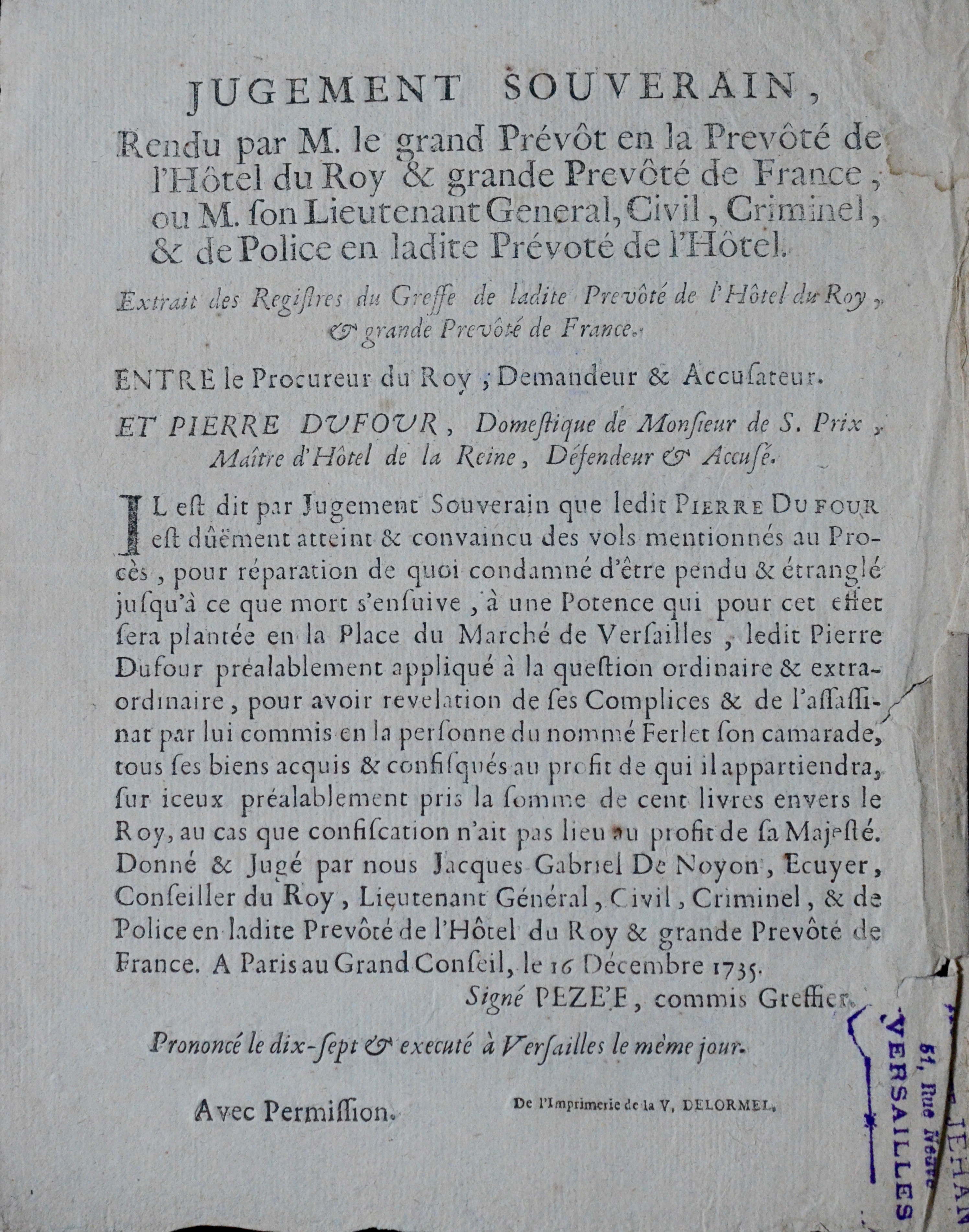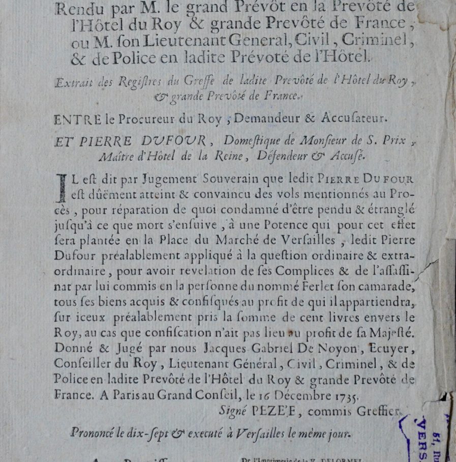 Imprimé du "Jugement souverain rendu par M. le grand Prévôt en la Prevôté de l'Hôtel du Roy [...]" contre Pierre Dufour, condamné pour vols à être "pendu & étranglé jusqu'à ce que mort s'ensuive, à une potence qui pour cet effet sera plantée sur la place du marché de Versailles". La Question ordinaire et extraordinaire lui sera appliquée au préalable "pour avoir révélation de ses complices & de l'assassinat par lui commis en la personne du nommé Ferlet, son camarade [...]".