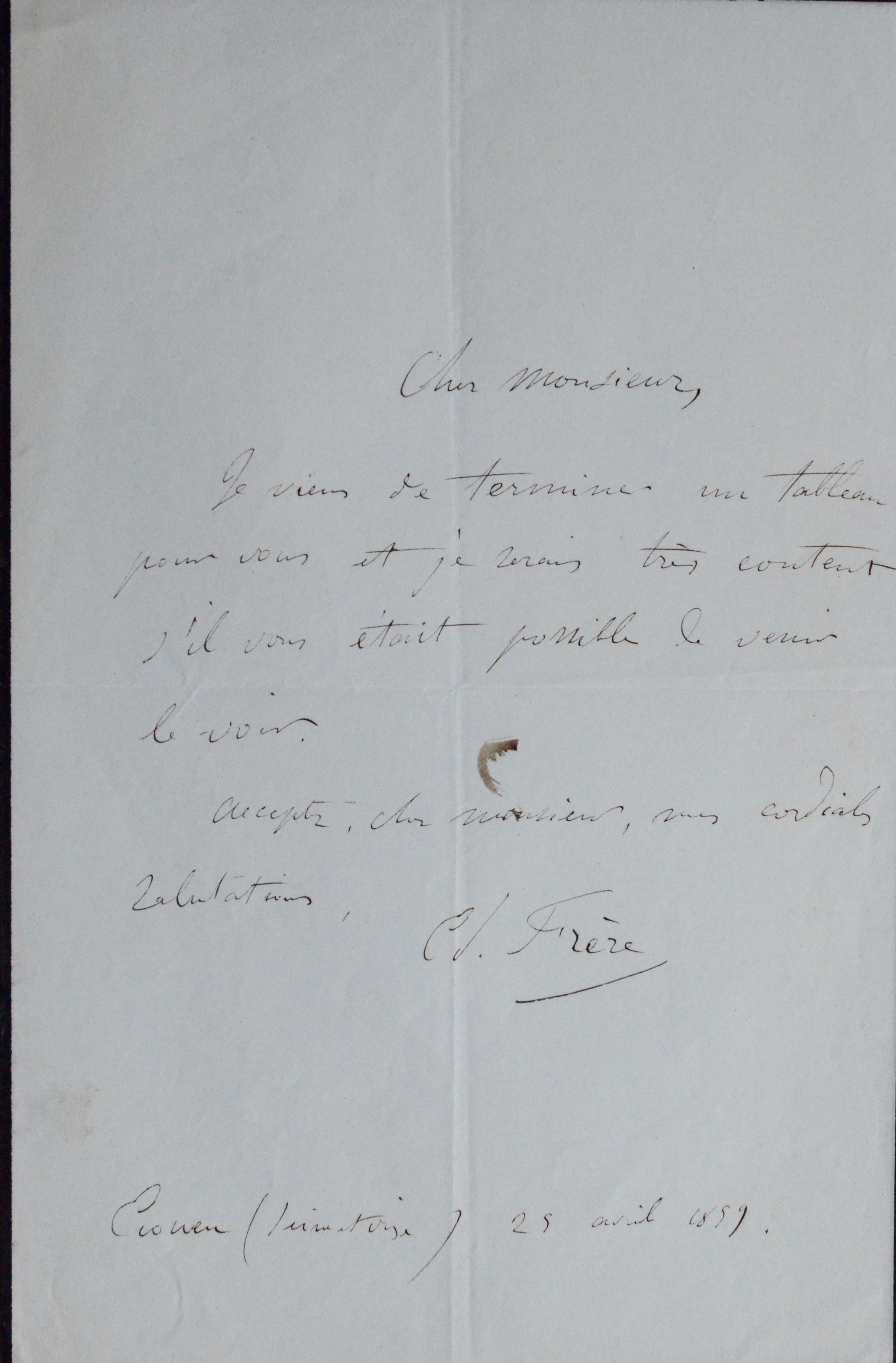 Pierre-Edouard Frère, depuis peu installé à Ecouen, achève un tableau, pour son correspondant : "Je viens de terminer un tableau pour vous et je serais très content s'il vous étoit possible de venir le voir [...]".