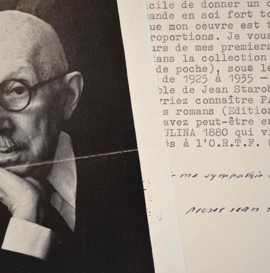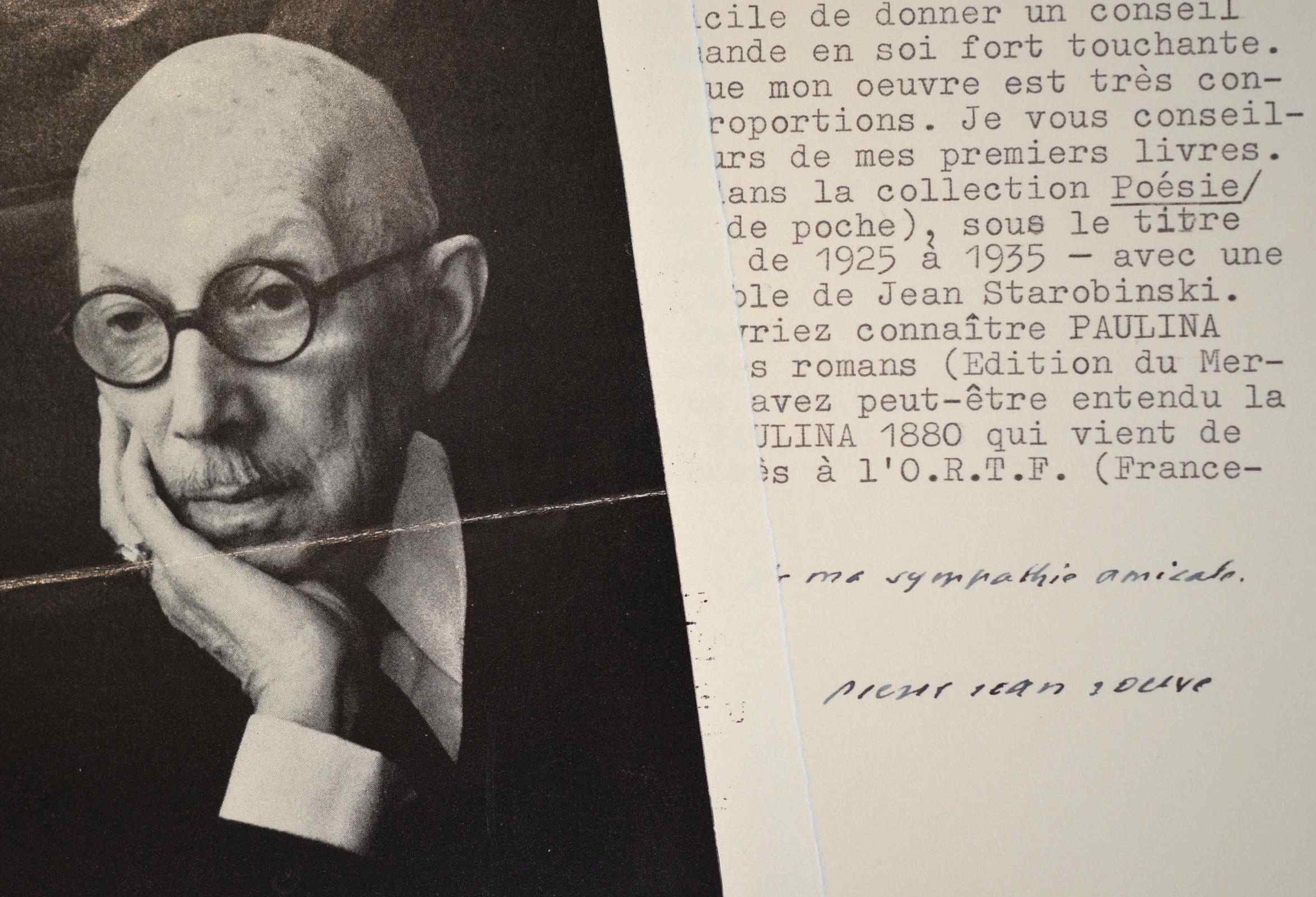 Pierre Jean Jouve donne des conseils pour la lecture de ses livres. «Vous n'ignorez pas que mon oeuvre est très considérable dans ses proportions. Je vous conseillerai de lire plusieurs de mes premiers livres. On vient de publier dans la collection Poésies / Gallimard (livre dit de poche), sous le titre Les Noces, mes poèmes de 1925 à 1935 avec une introduction remarquable de Jean Starobinski. D'autre part, vous devriez connaître Paulina 1880, le premier de mes romans [...]». La seconde pièce est un portrait imprimé, dédicacé par Jouve (pliure centrale).