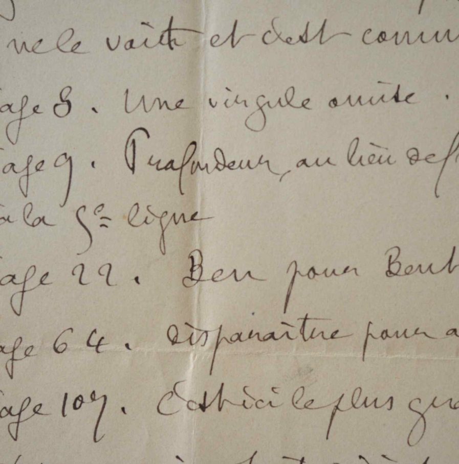 Par cette page manuscrite, Pierre Loti donne les corrections à son éditeur, Calmann-Lévy, pour la publication des Trois femmes de la Kasbah, nouvelle qui était parue, en novembre 1882, dans le recueil, Fleurs d'ennui. "1° Pour le titre. Je voudrais qu'on rétablit page 1 les mots (conte oriental) qui ont été supprimés, je ne sais pourquoi. 2 ° Page 7. Il faut rétablir la dédicace, "à mon ami Plunkett" sans laquelle je ne peux plus me servir à la fin de ce Plunkett dont j'ai absolument besoin. Il faut rétablir aussi : (au nom d'Allah, etc.). C'est très gentil de me l'avoir mis page 5 dans un encadrement arabe, mais personne ne le voit et c'est comme si on l'avait supprimé du texte [...]. 7° Page 107. C'est ici le plus grave. La phrase qui commence La moralité et qui a été supprimée, était déjà supprimée dans cette 15è édition de Fleurs d'ennui que vous m'envoyez. Qui a pu se permettre cela? Je l'ai rétablie. Mais l'Epilogue de Plunkett me semble indispensable à maintenir, tel qu'il est dans Fleurs d'ennui ; il le faut absolument, pour expliquer l'incohérence voulue de l'histoire et juger comme elle le mérite cette moralité narquoise. Si on supprime l'Epilogue Plunkett, la moralité demeure simplement idiote". Il termine par une pique à son éditeur : "Moralité de ce qui est ci-dessus : il ne faudrait pas couper dans une oeuvre qui se tient sans avoir pris l'avis de l'auteur".